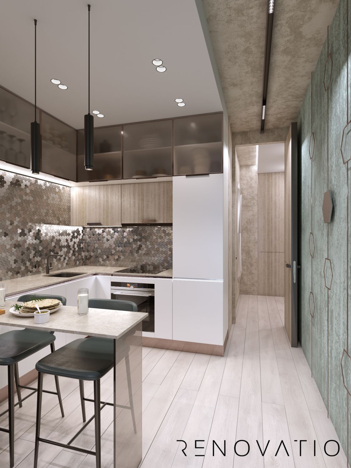 The kitchen-dining area is small, but at the same time, due to the compact arrangement of all elements, everything you need is present in it. The working area is laid with mosaics, which removes the visual load from the walls. Lightness is added by white furniture and zoning in lighting.