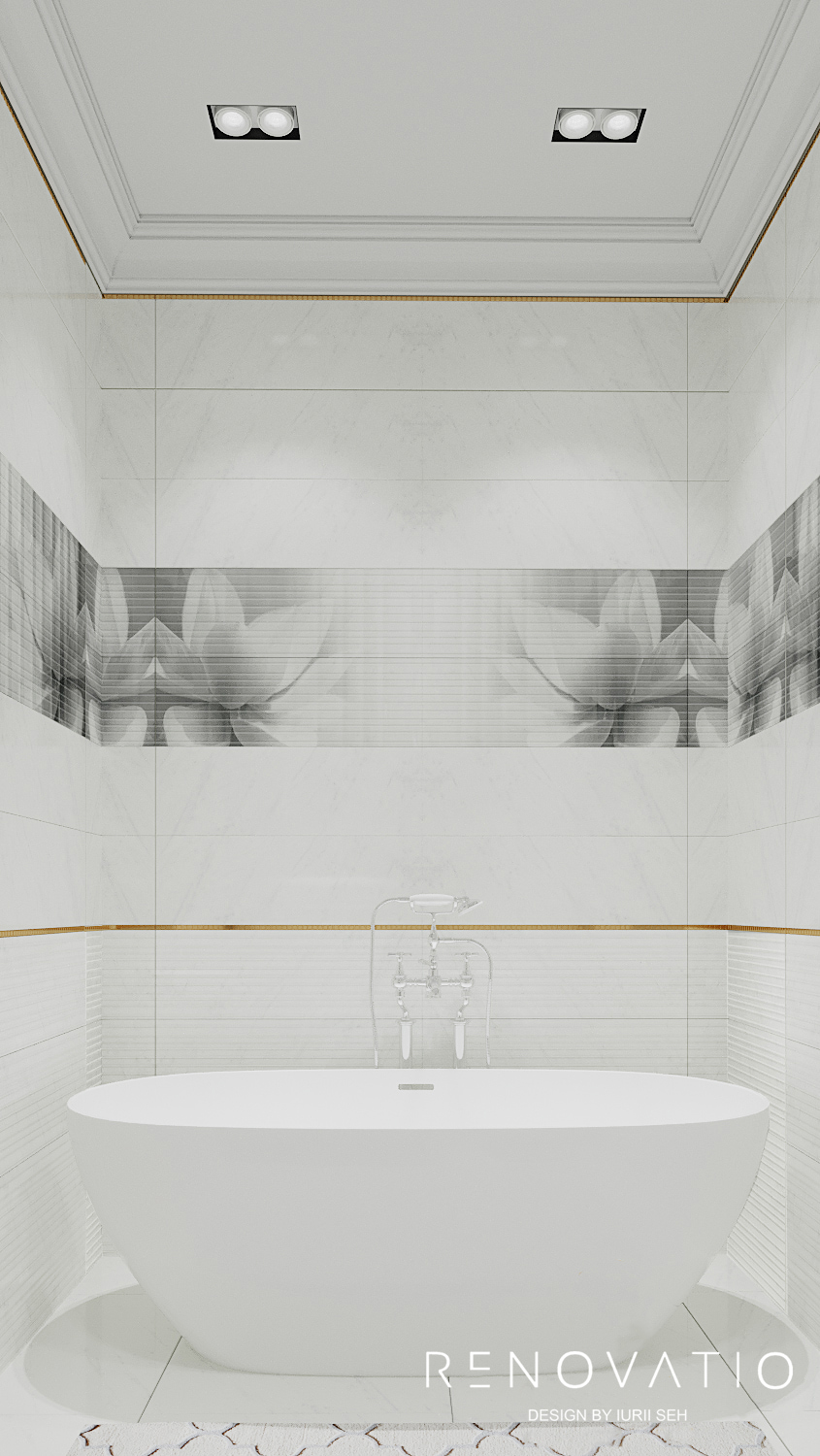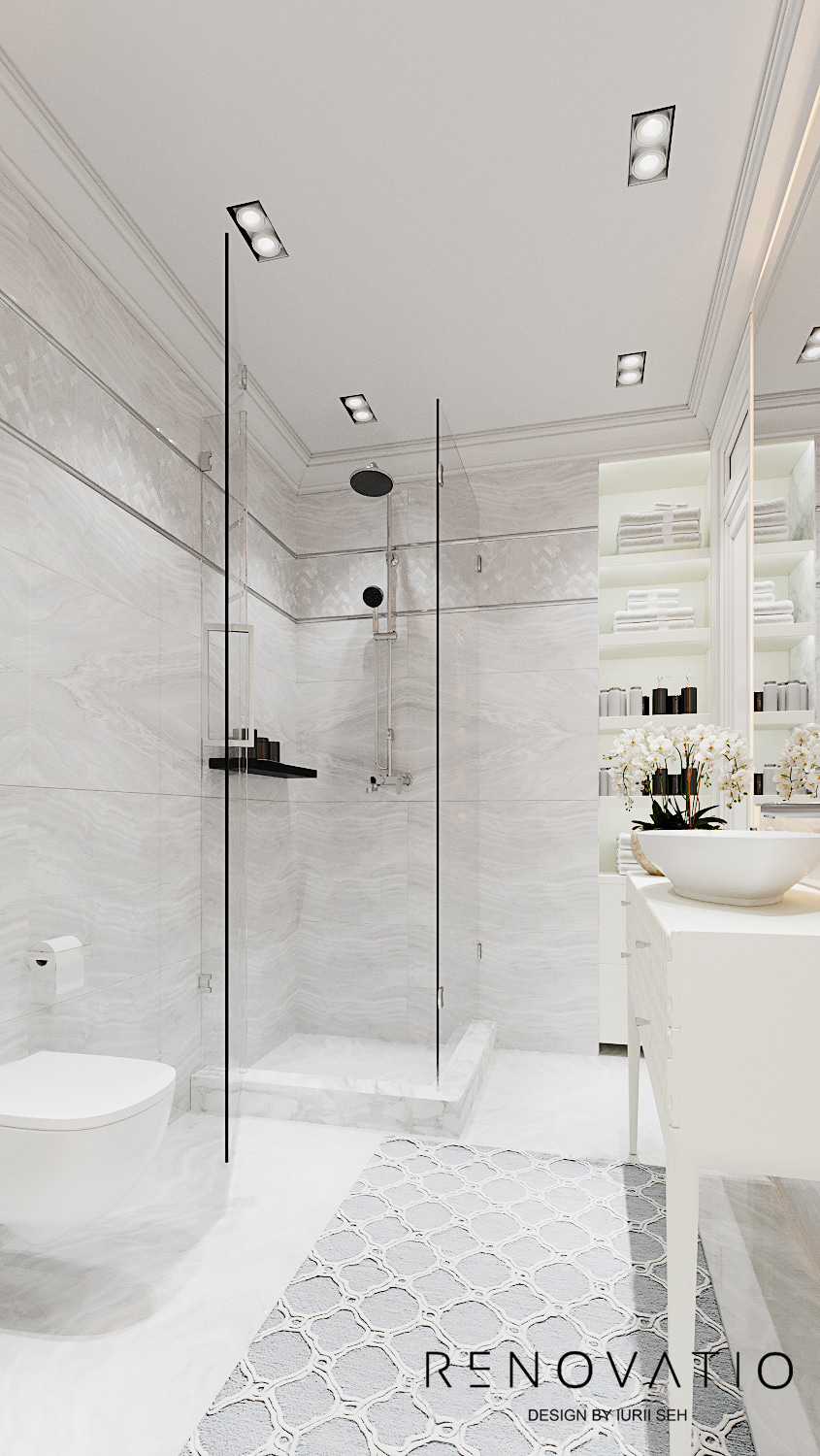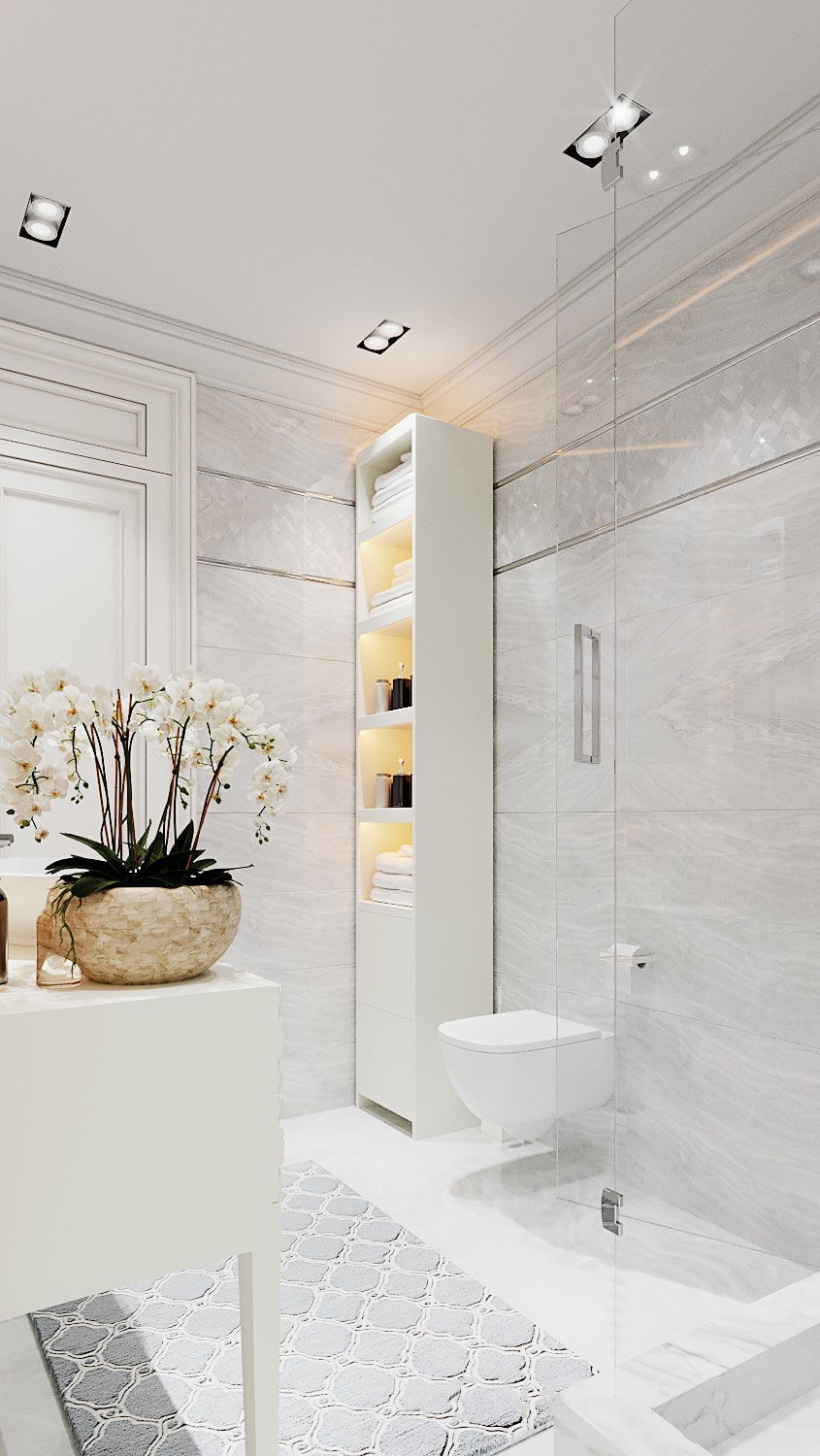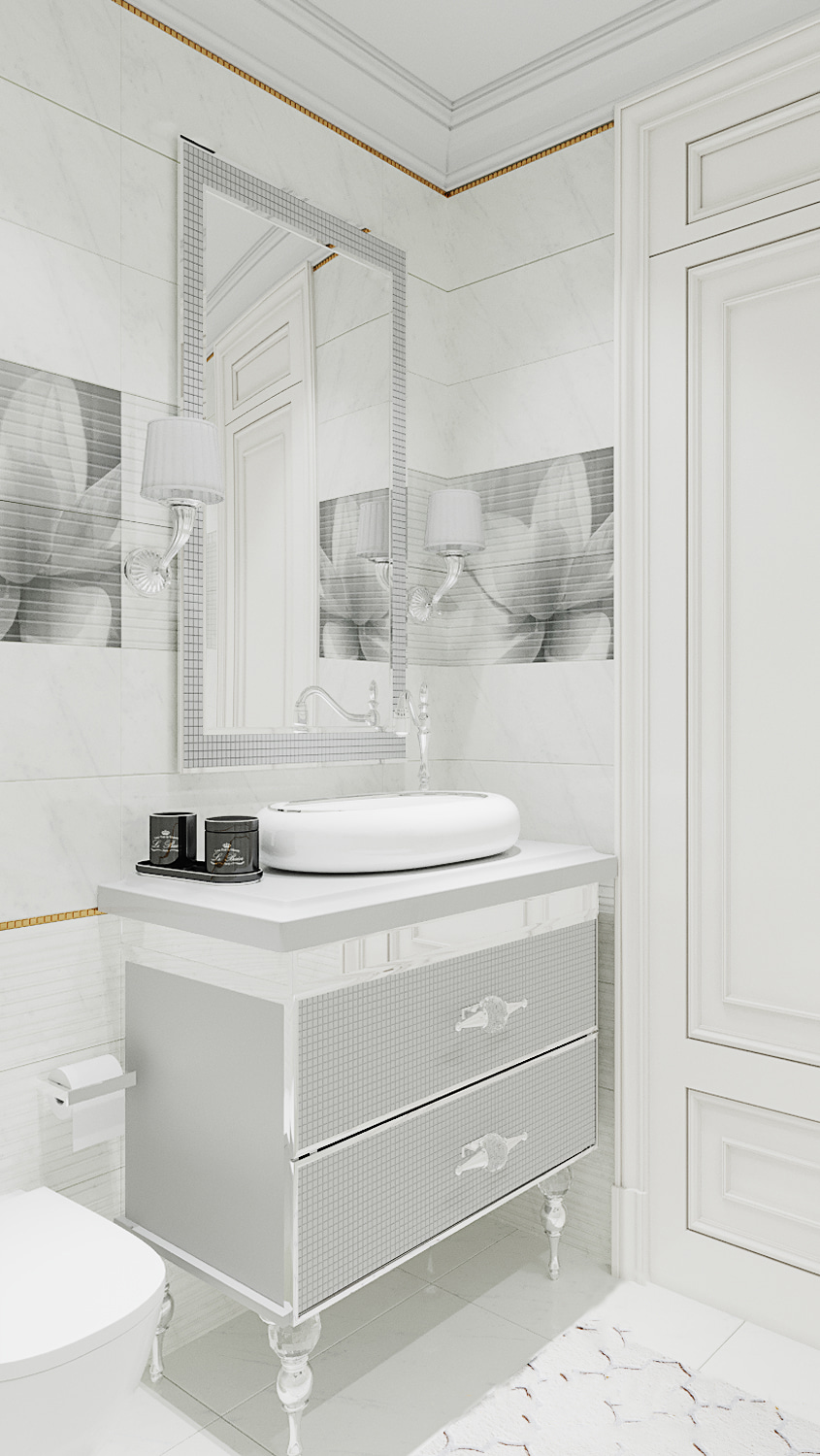 Two bathrooms are made in crystal white. Glass, stainless steel, ceramics and marble were used for decoration. Spot ceiling lighting and sconces in the work area allowed to maximize the diversity of mood in the rooms.