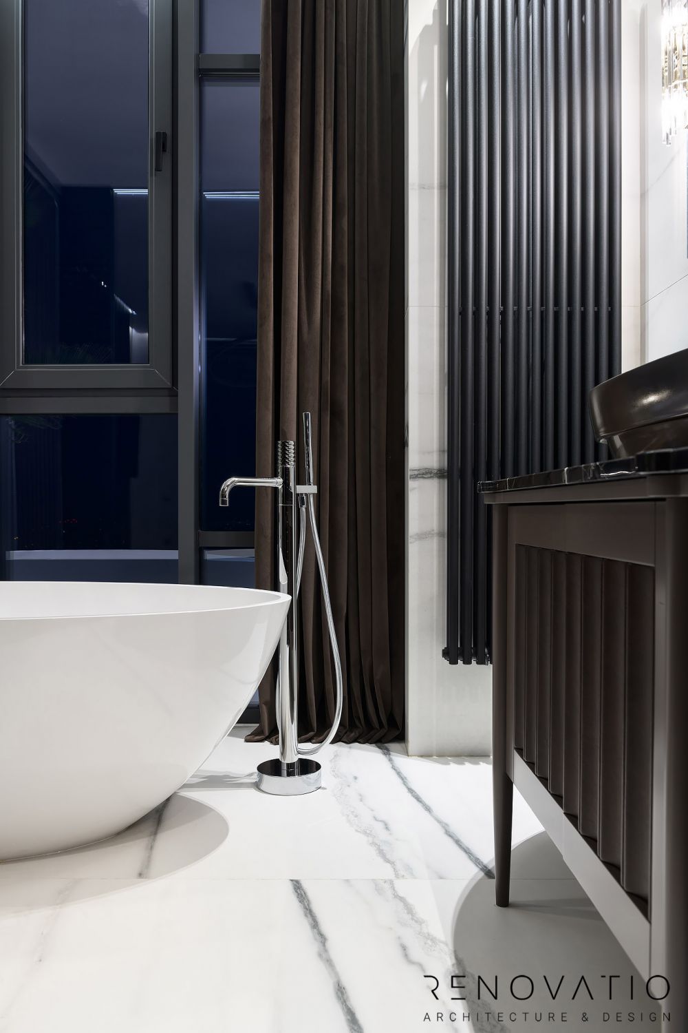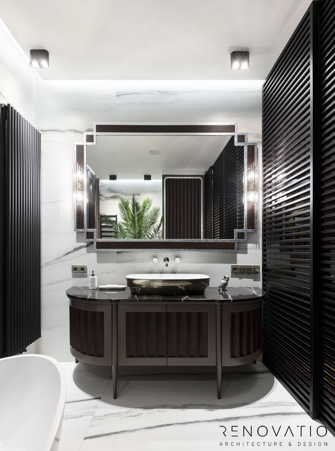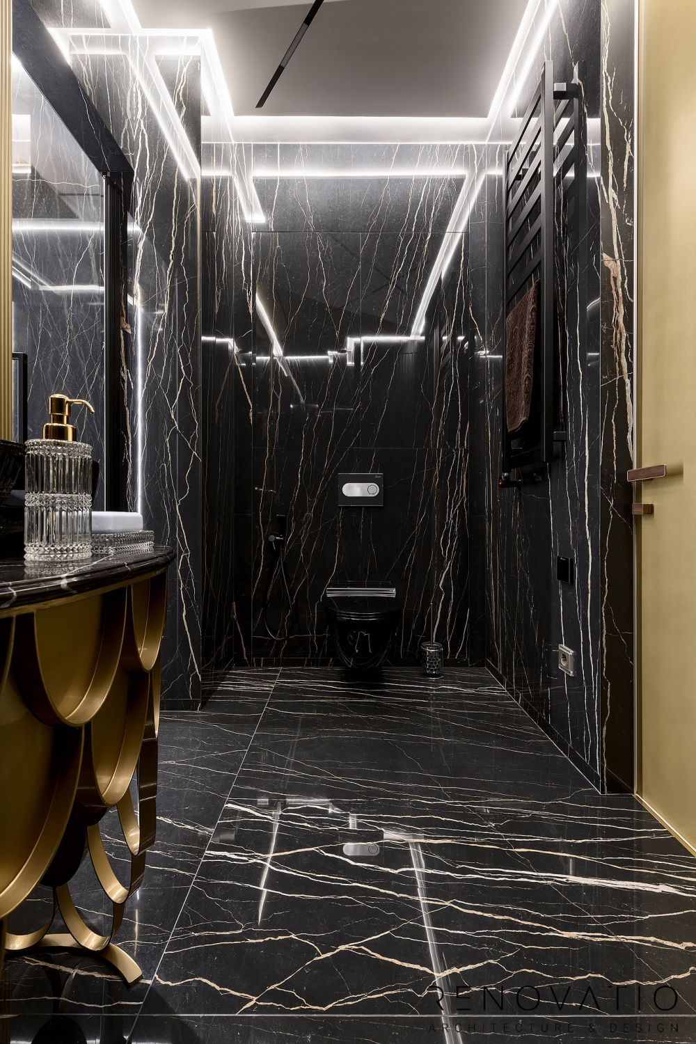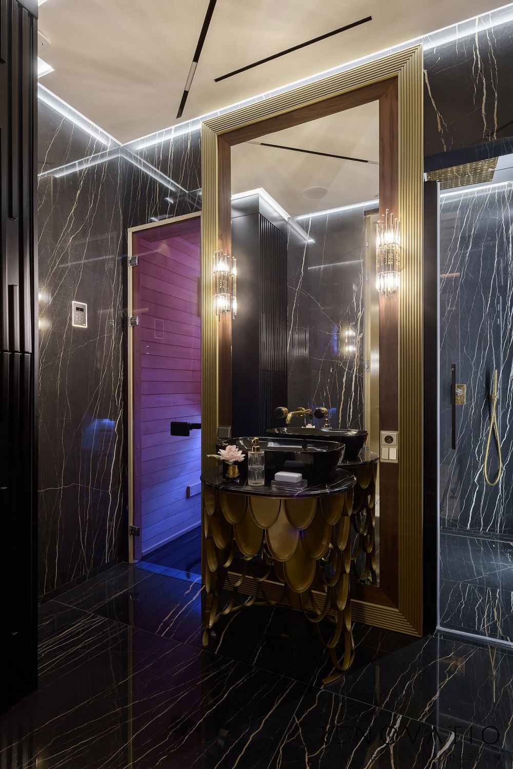 A special love is a stylish sauna. Aesthetics at the highest level, black marble with gold fittings, while maintaining all the functionality, all the rules of such premises.