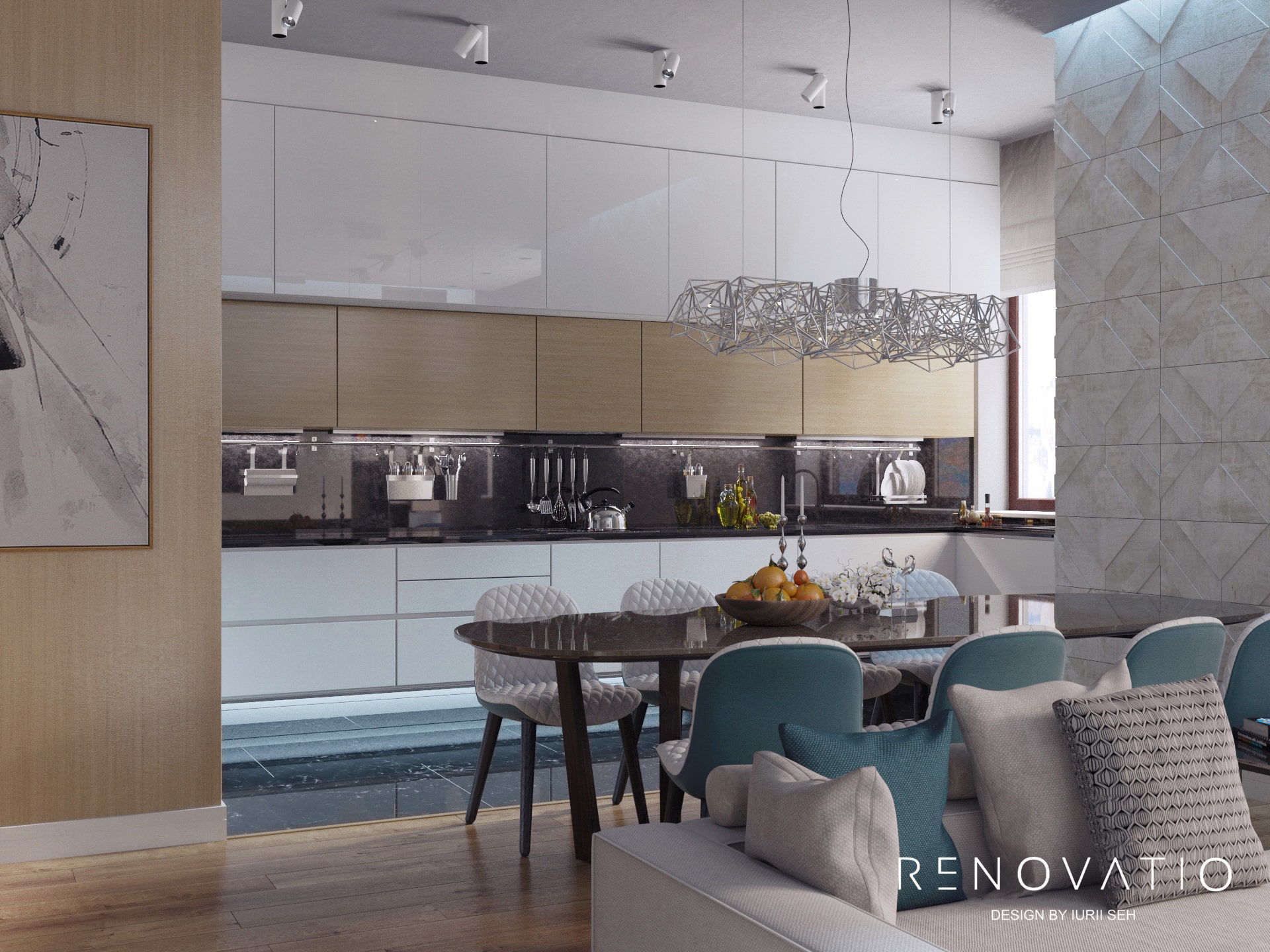 The living area is successfully combined with the dining room. Luxurious natural wood floors, a panoramic window with light textiles, a small comfortable sofa with many pillows to match the textiles of the dining chairs are perfectly complemented by an unusual chandelier shape.
