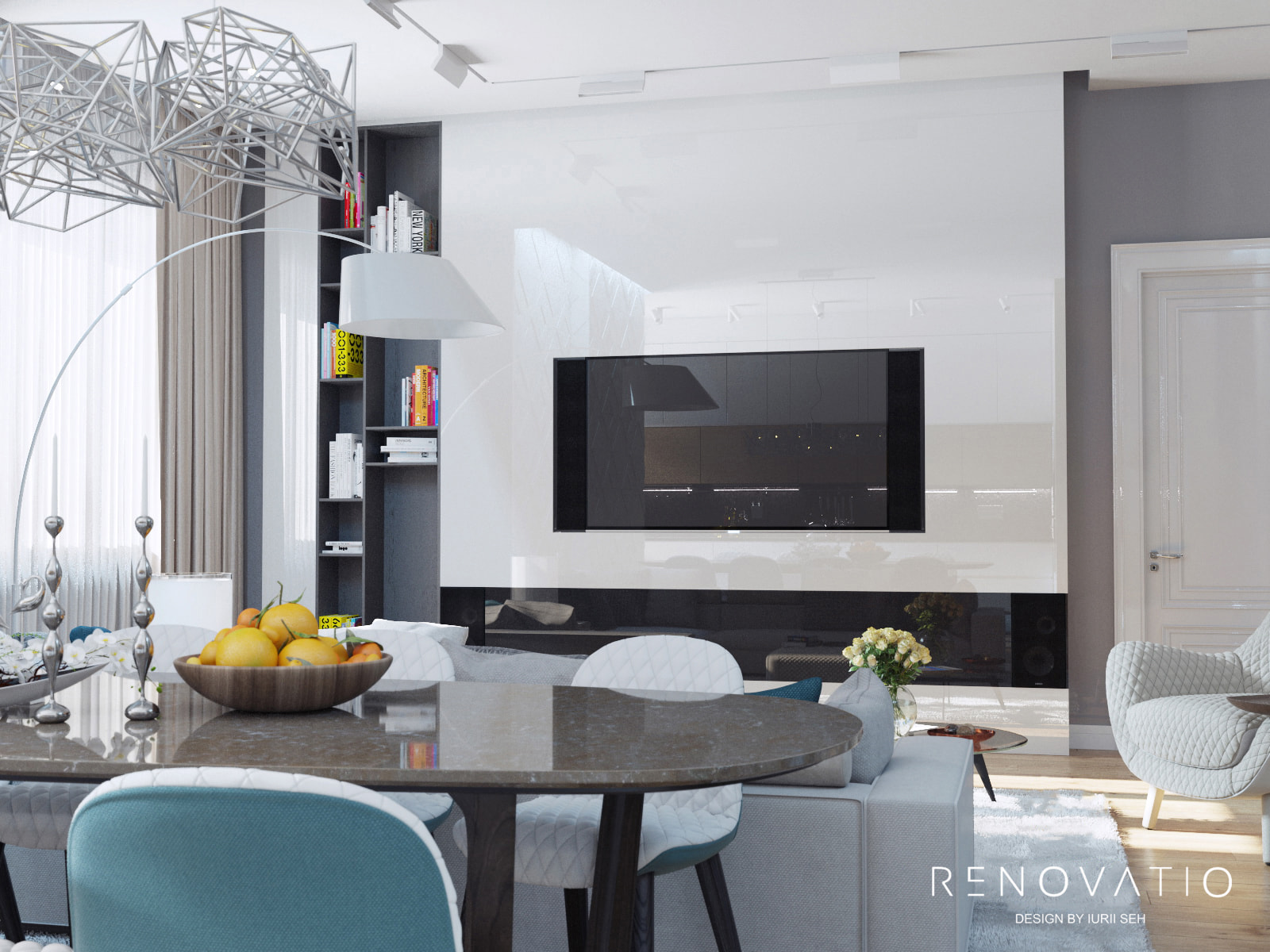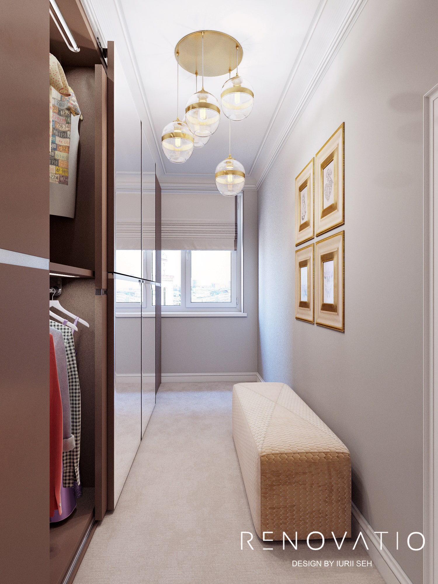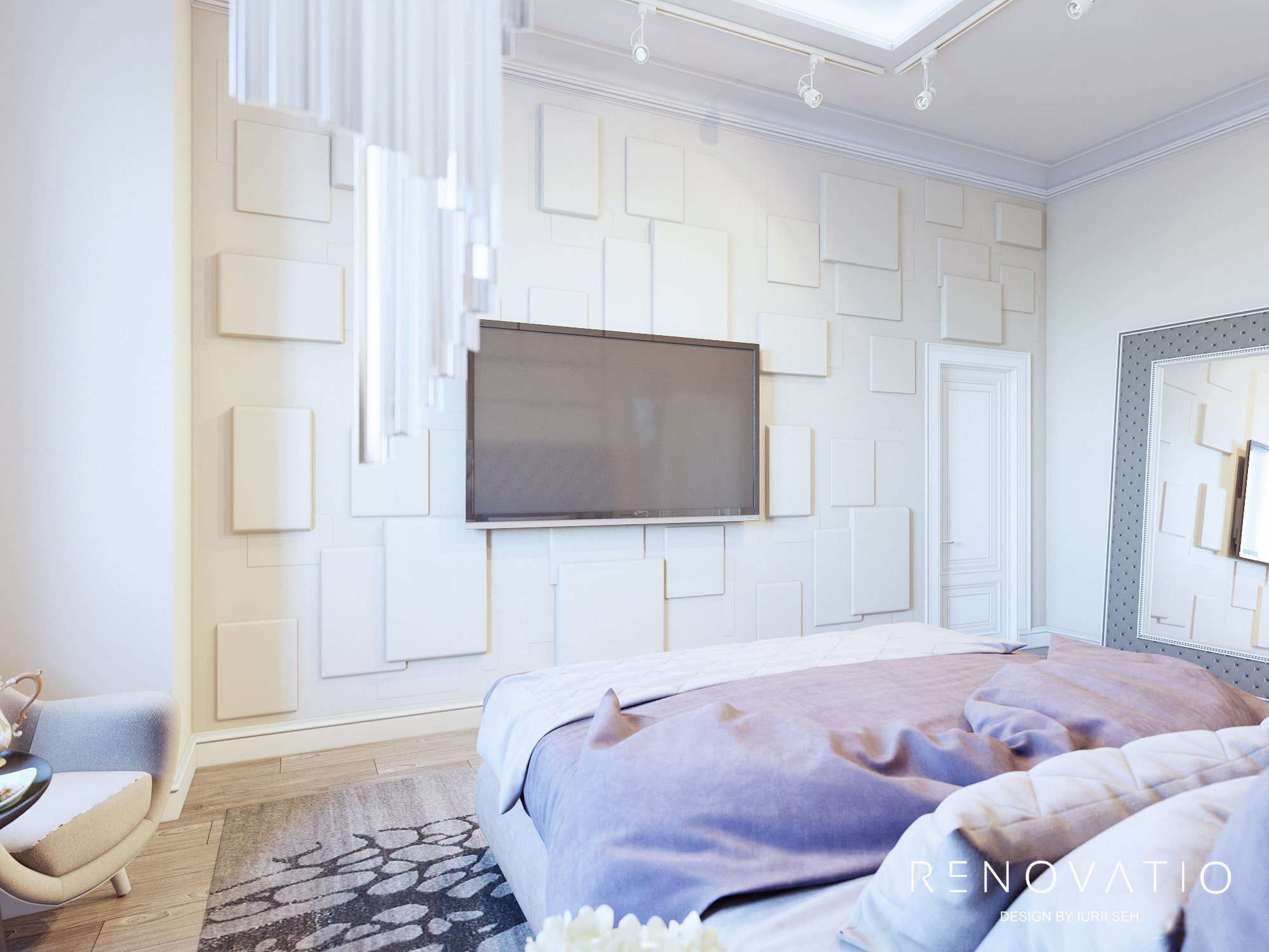 Designer furniture, lighting and accessories from well-known world brands complement the very unobtrusive and dignified color palette of this apartment, ranging from impeccable natural beige, coffee, gold and ending with deep purple and gray.