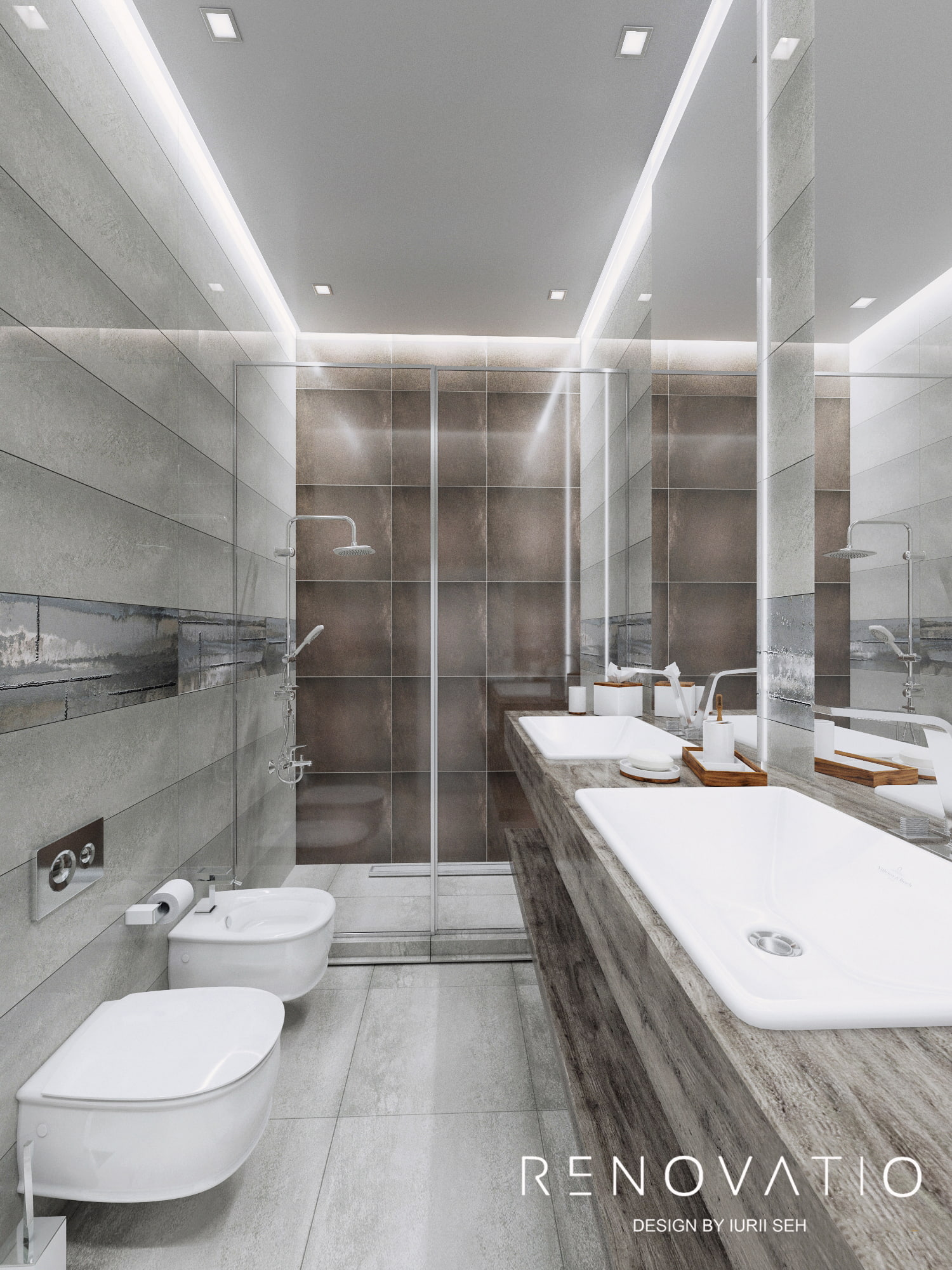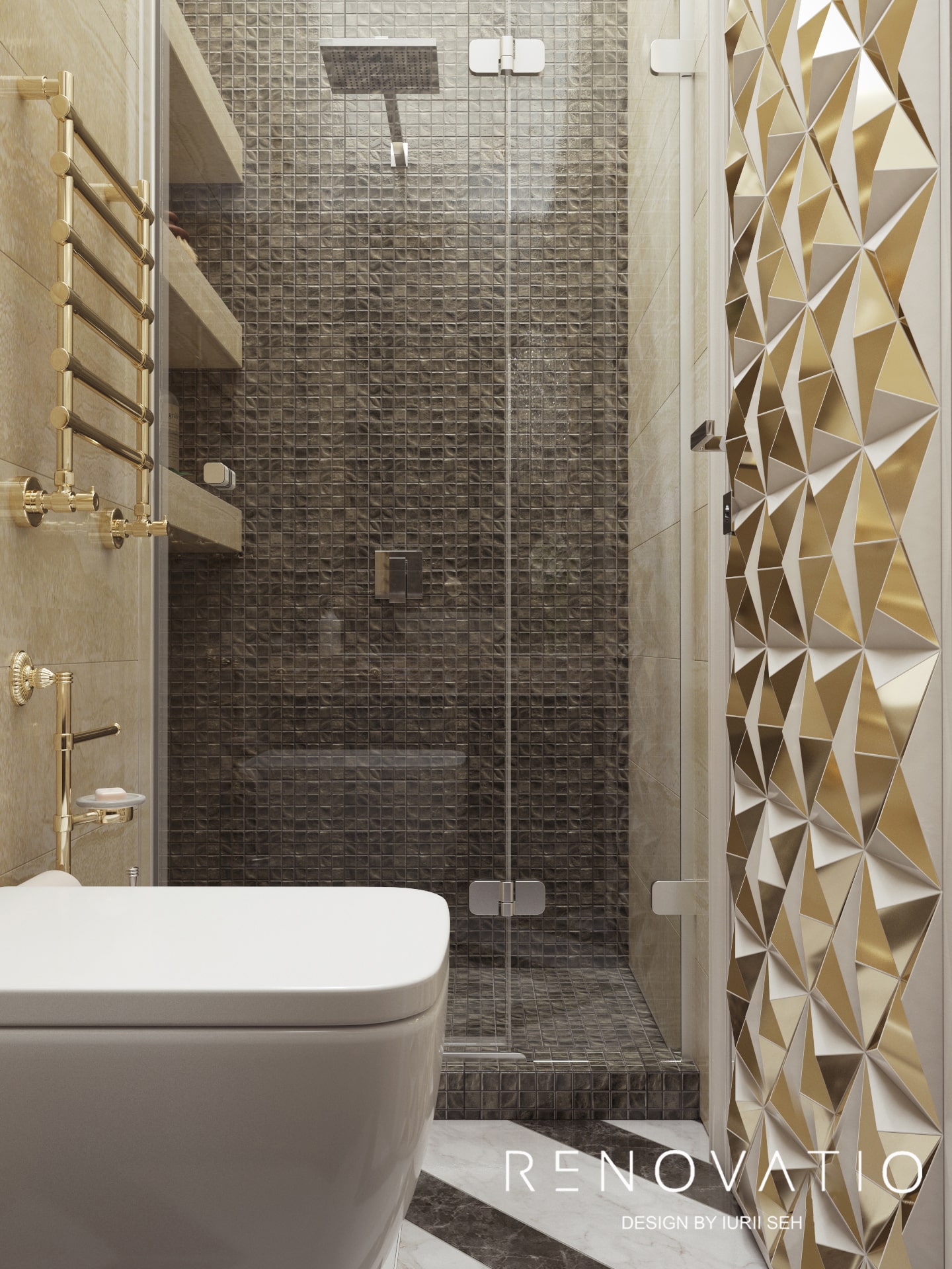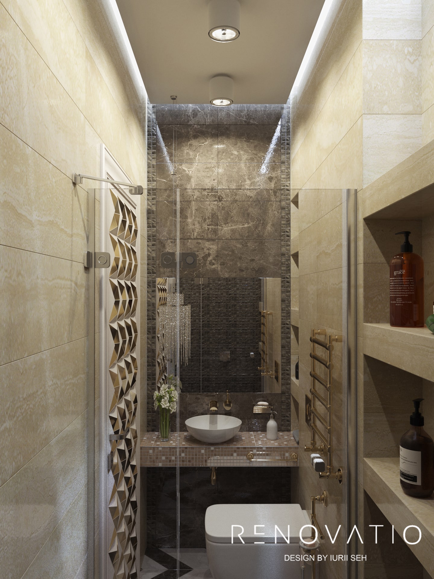 Designer furniture, lighting and accessories from well-known world brands complement the very unobtrusive and dignified color palette of this apartment, ranging from impeccable natural beige, coffee, gold and ending with deep purple and gray.