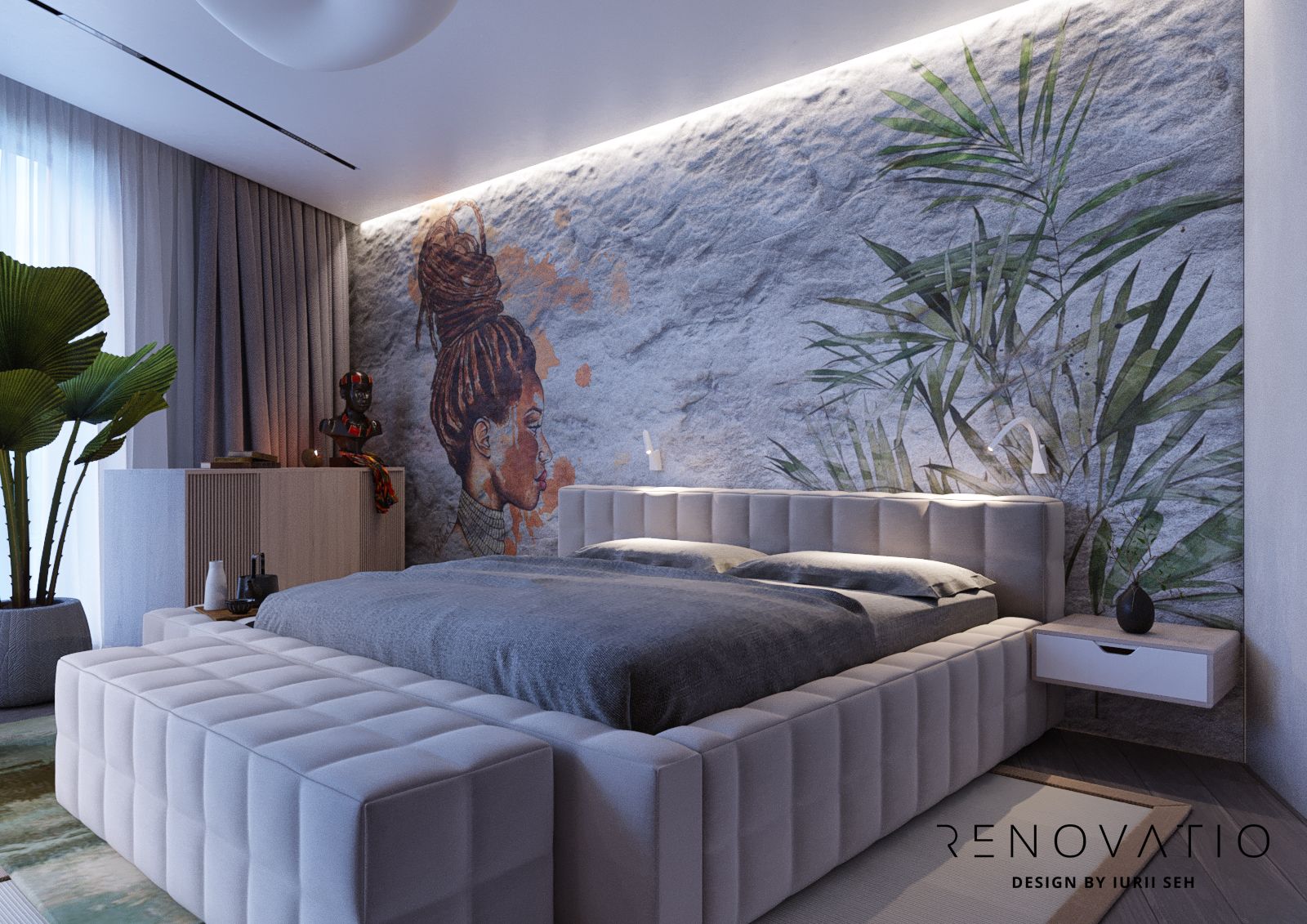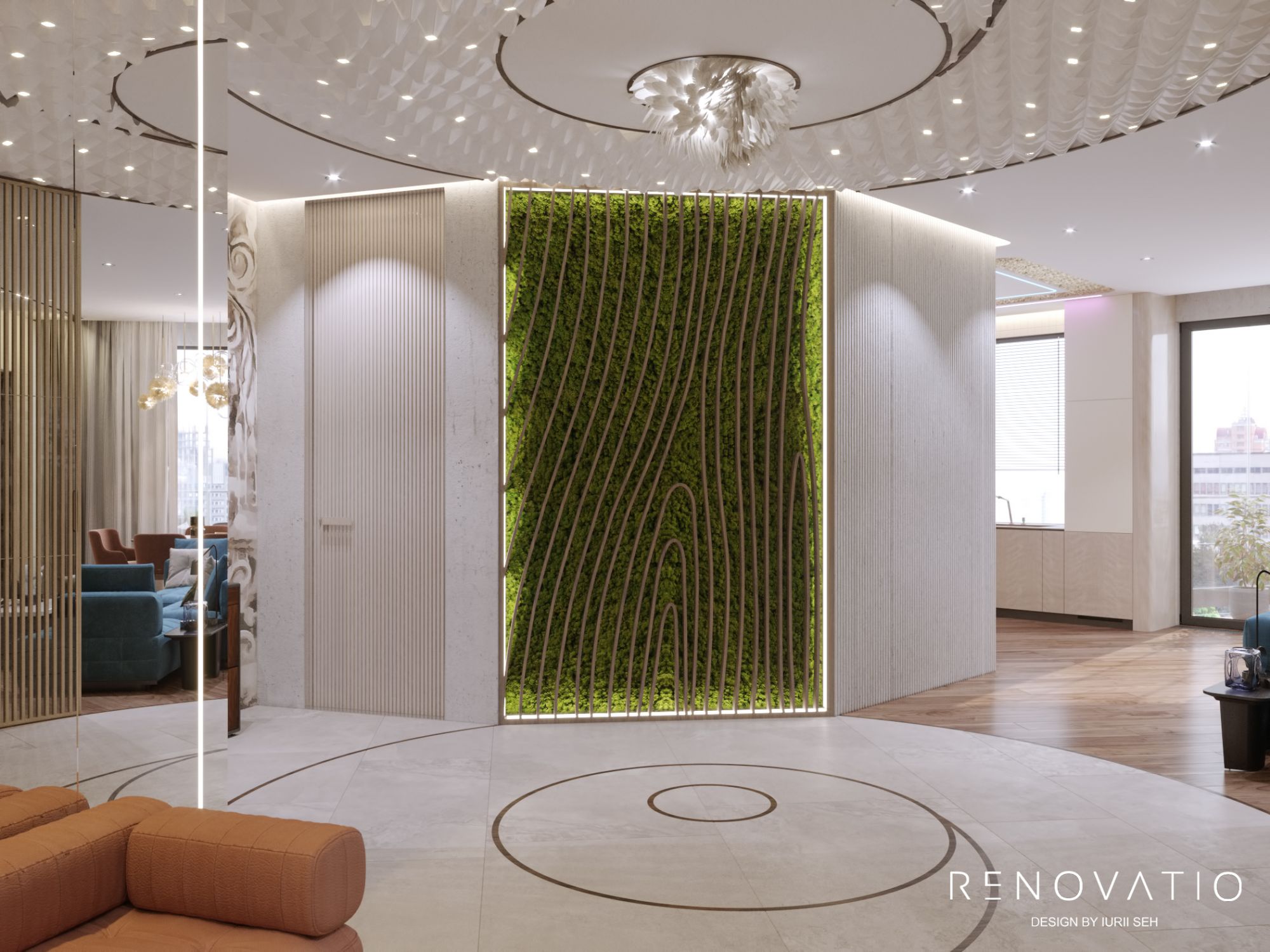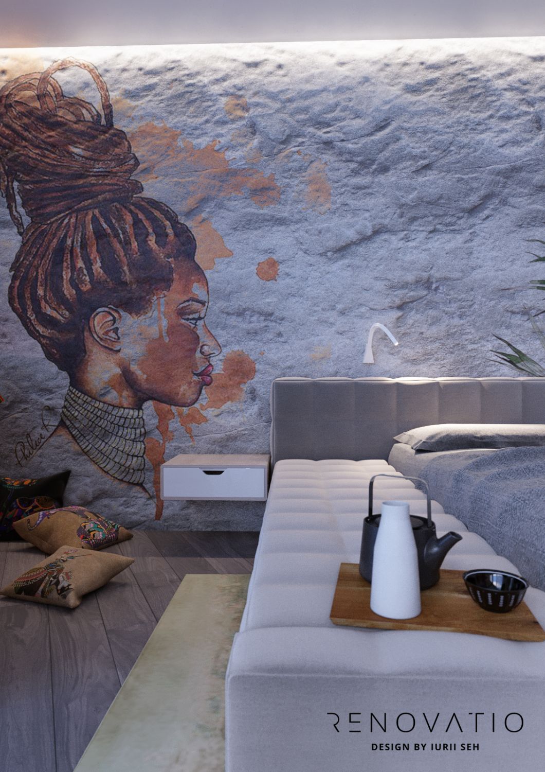 Elements of modern art everywhere: in the living room, bedroom, dressing room and even in the mirror in the bathroom. These are images on the wall, paintings and even whole "living" green walls. They seem to fill the whole area with oxygen, they become a real magnet for the attention of all guests.
