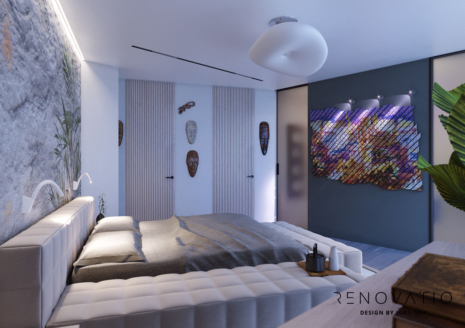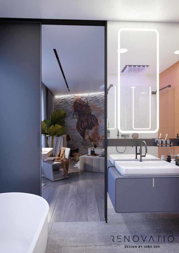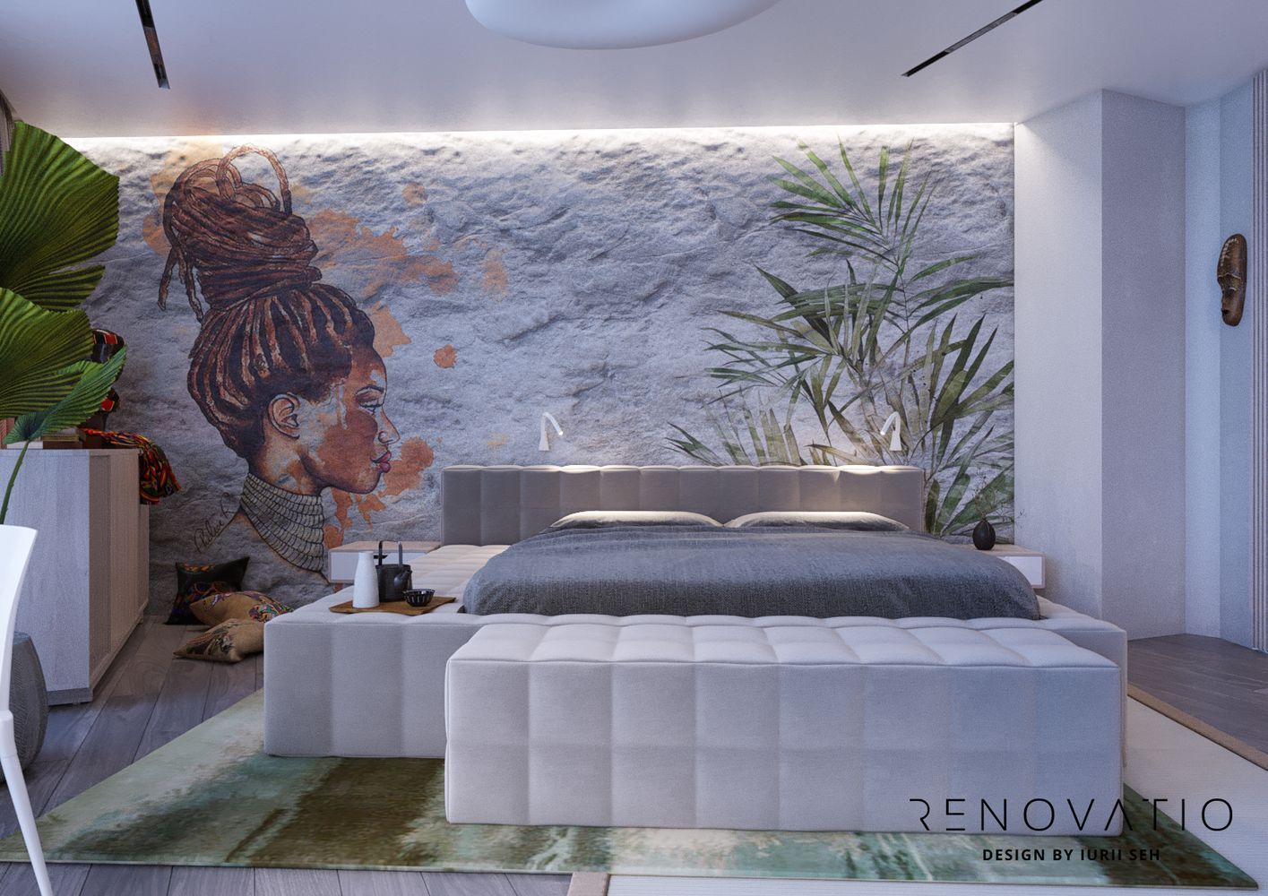 Elements of modern art everywhere: in the living room, bedroom, dressing room and even in the mirror in the bathroom. These are images on the wall, paintings and even whole "living" green walls. They seem to fill the whole area with oxygen, they become a real magnet for the attention of all guests.