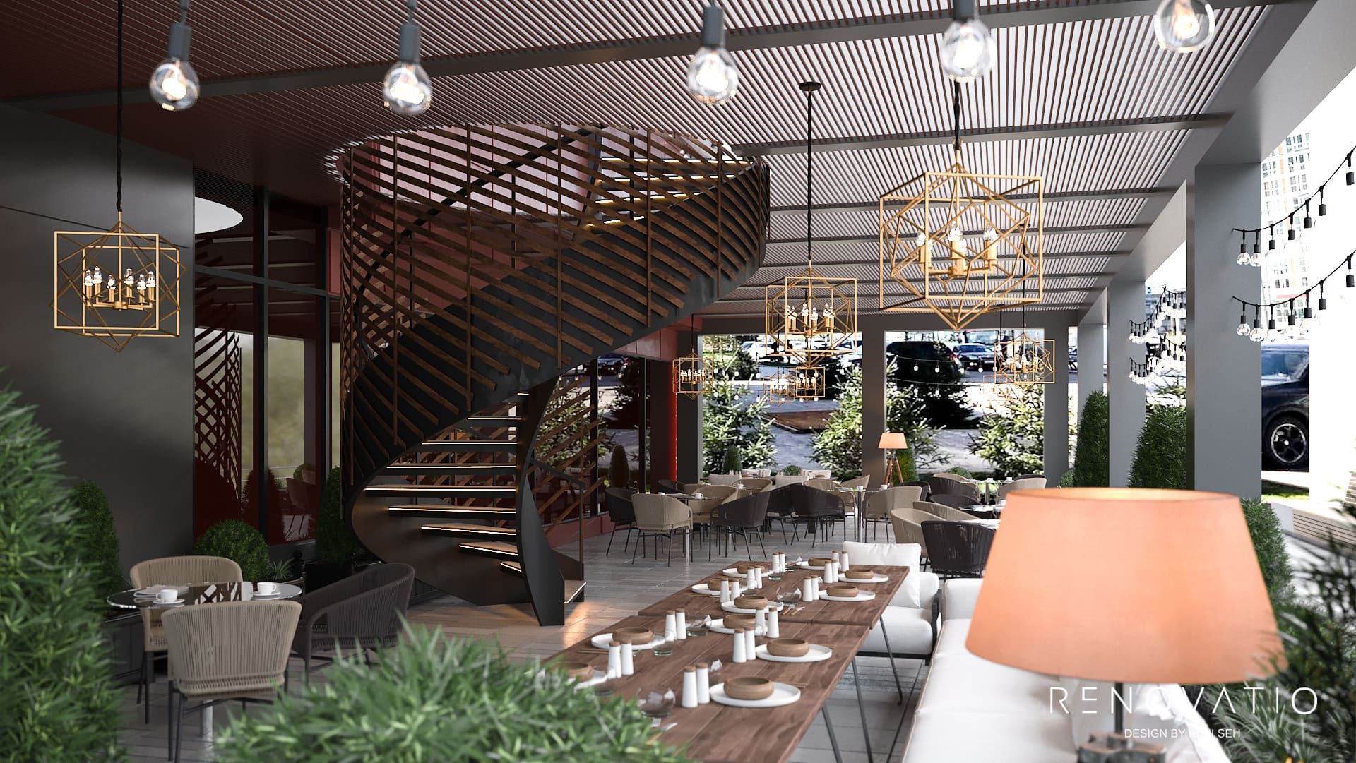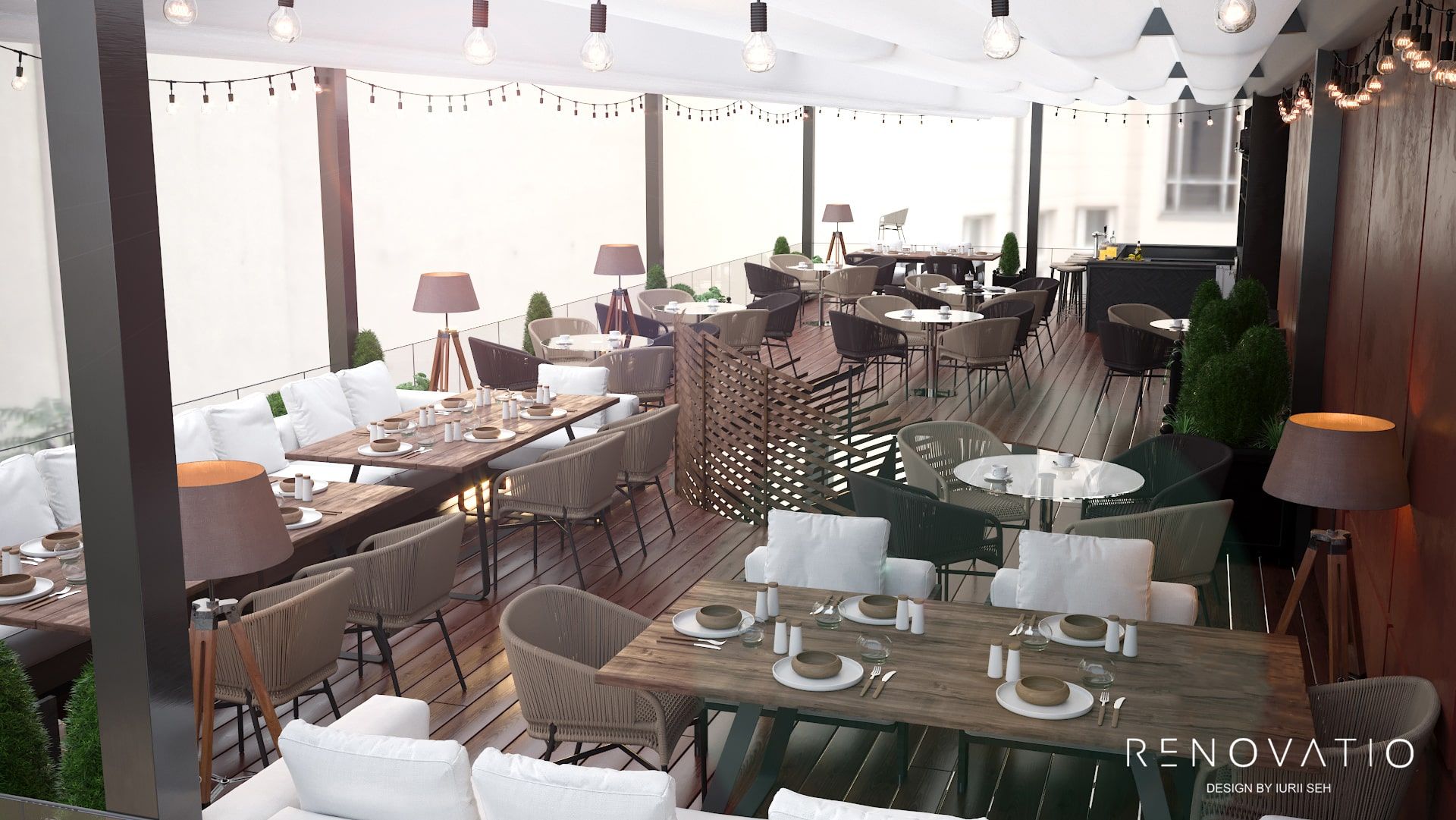 A terrace with huge windows is a great solution. By adding a little greenery and spot lighting to the interior, the result is the most romantic design. The tables are made of natural wood, which adds comfort and warmth.