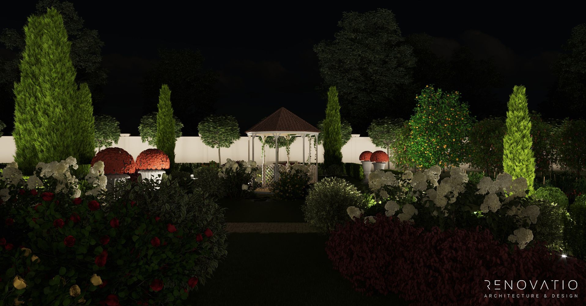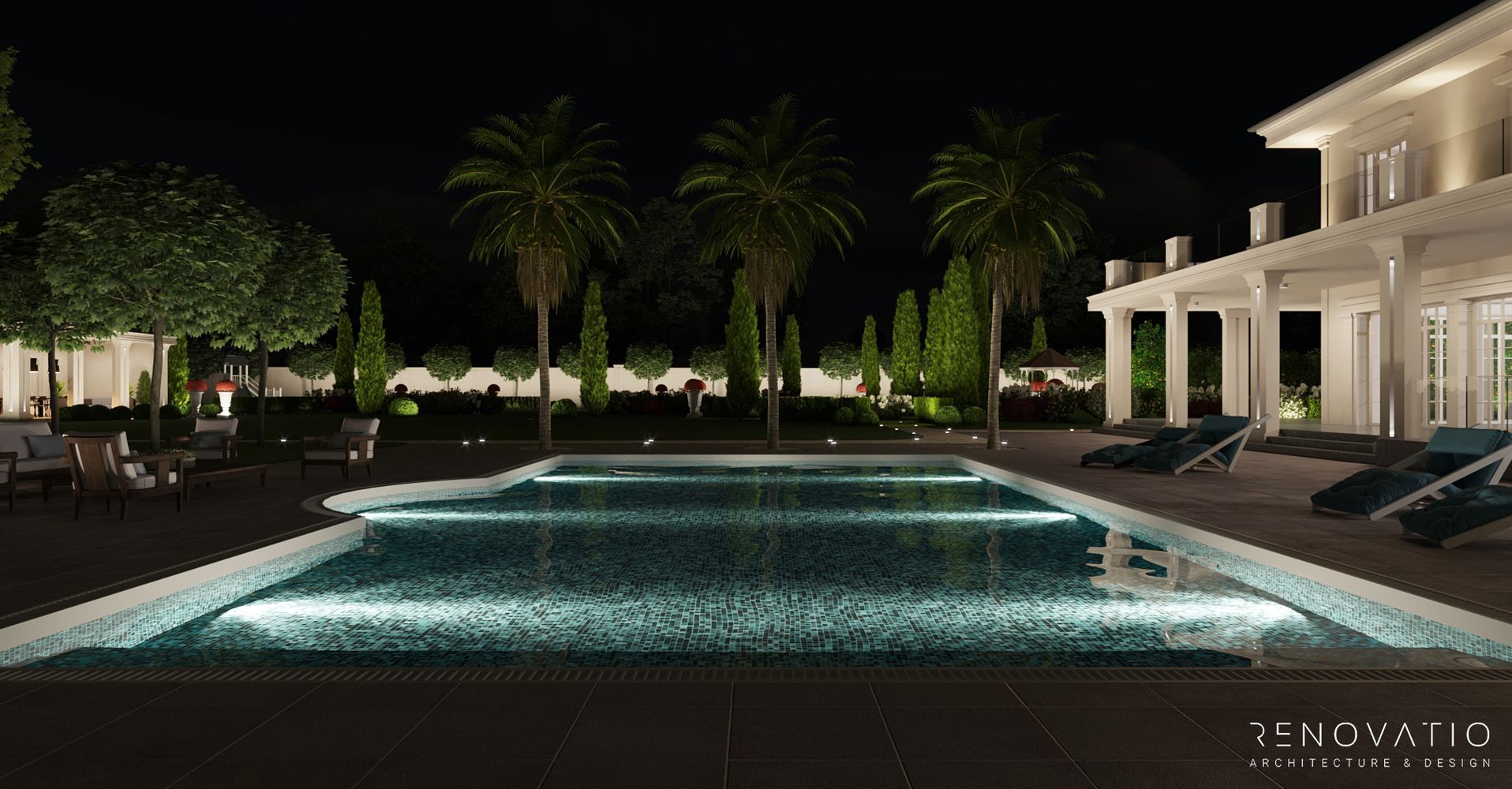 In this project, we have developed several recreation areas: several gazebos for solitude or loud outdoor parties, a pool area with palm trees and a garden area. Each area has a special well-designed lighting. The house itself is also equipped with a lighting system, so the exterior at night looks just as refined, stylish and elegant.