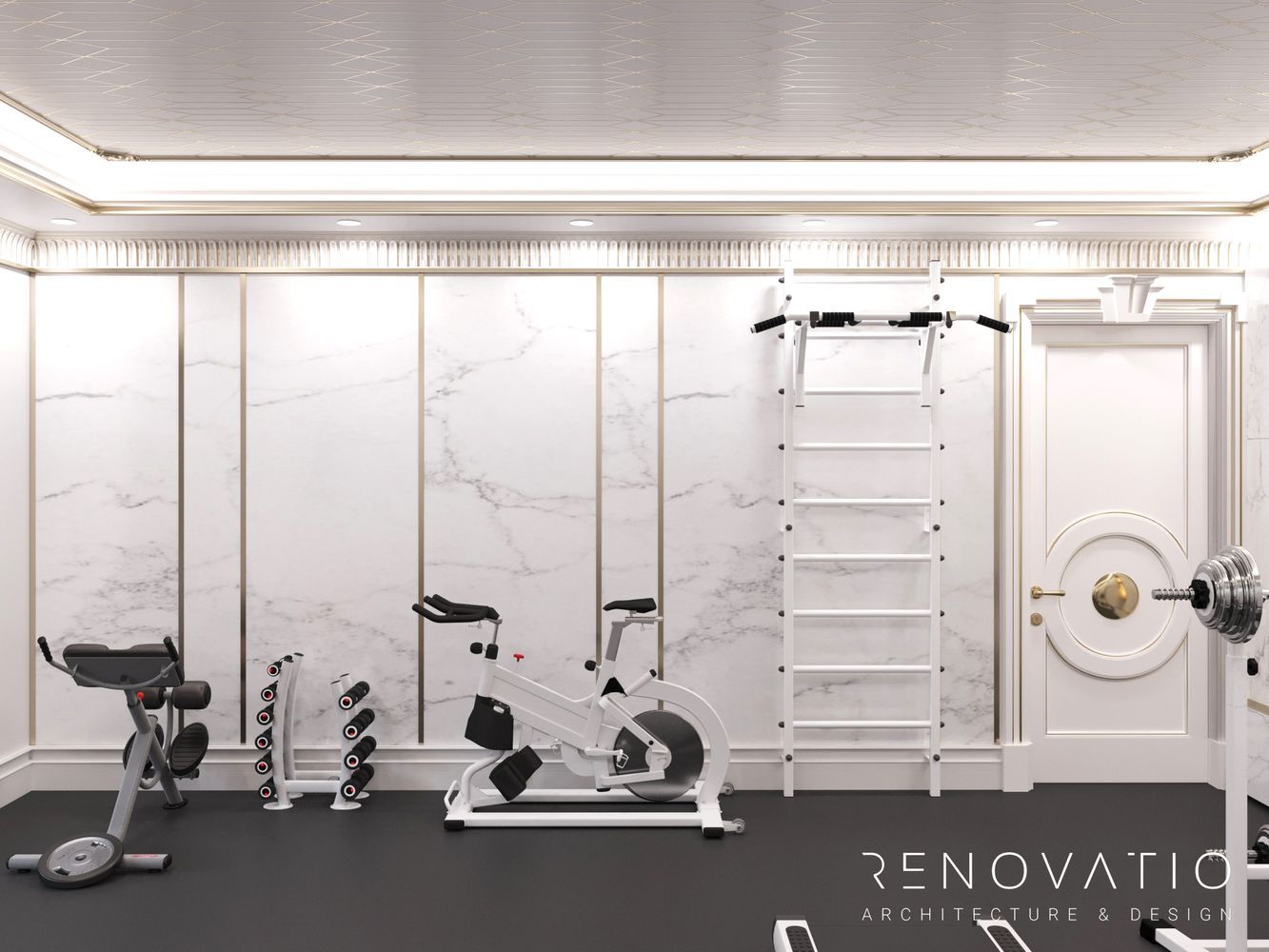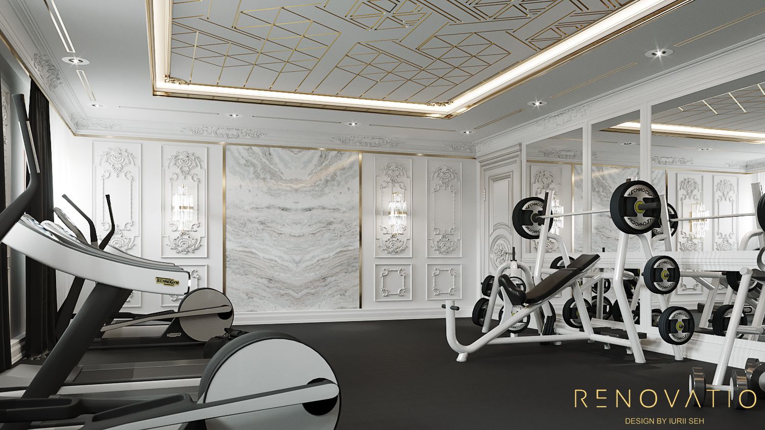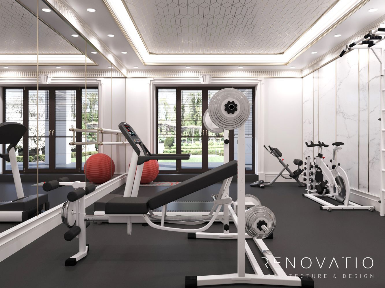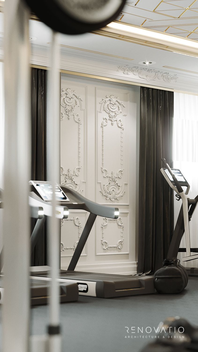 The hall is designed in a classic style, in muted gray and white colors so as not to stand out from the overall design of the house. The room has large windows, so we placed the mirrors on the next wall. The floor is made of soundproofing material, so when some family members go in for sports, it absolutely does not interfere with others.