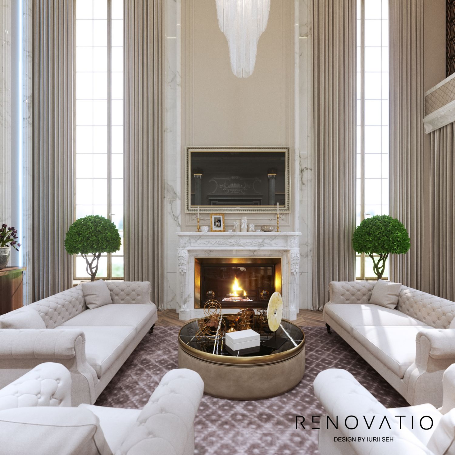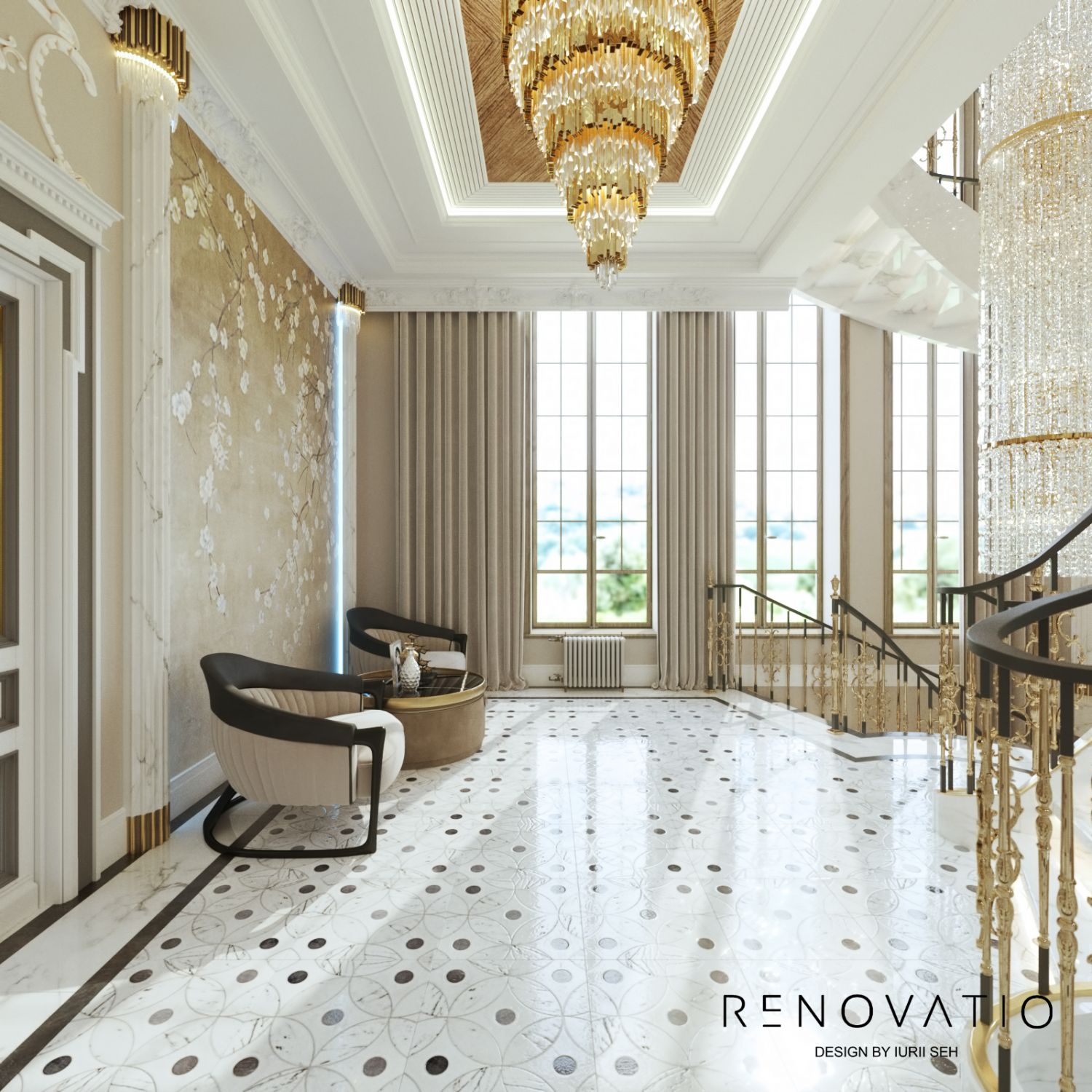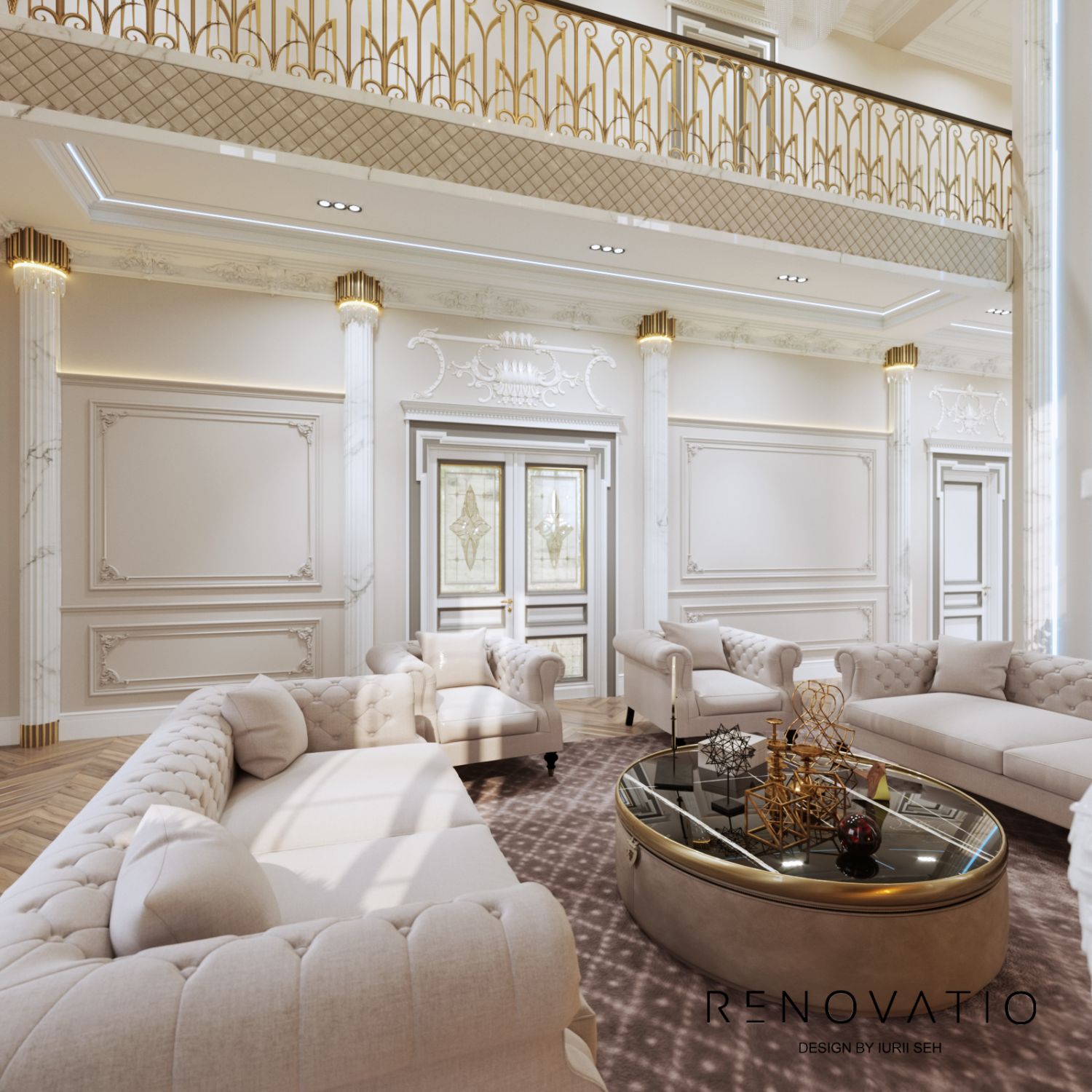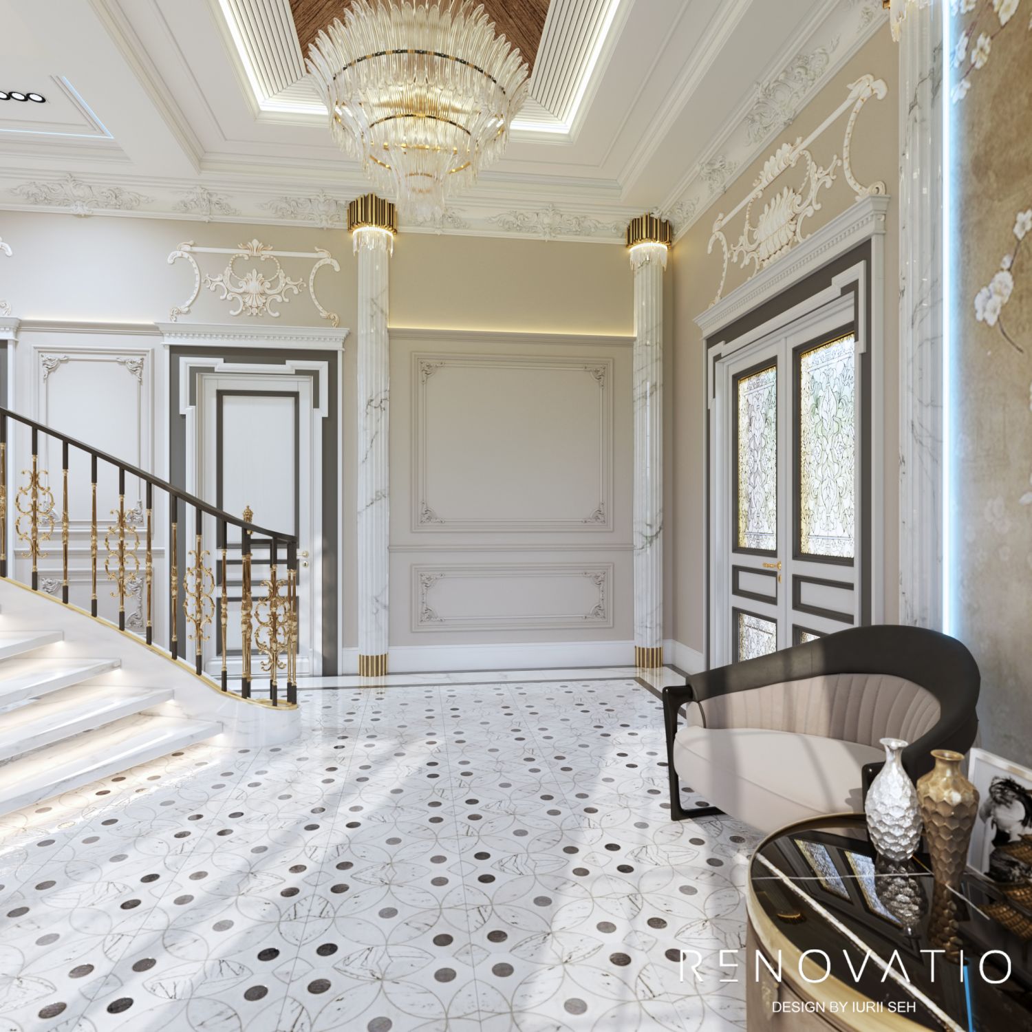 Gold is a noble metal. That is why we used it in the classic design of the 8611 sq.ft. house. It is not for nothing that the luxury and radiance of palaces delight us with their grandeur. This greatness is only emphasized by various decorative elements in gold: chandeliers, stair railings, decorative framing of columns.