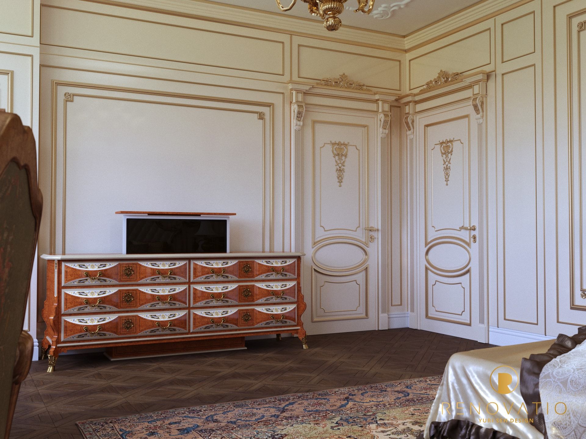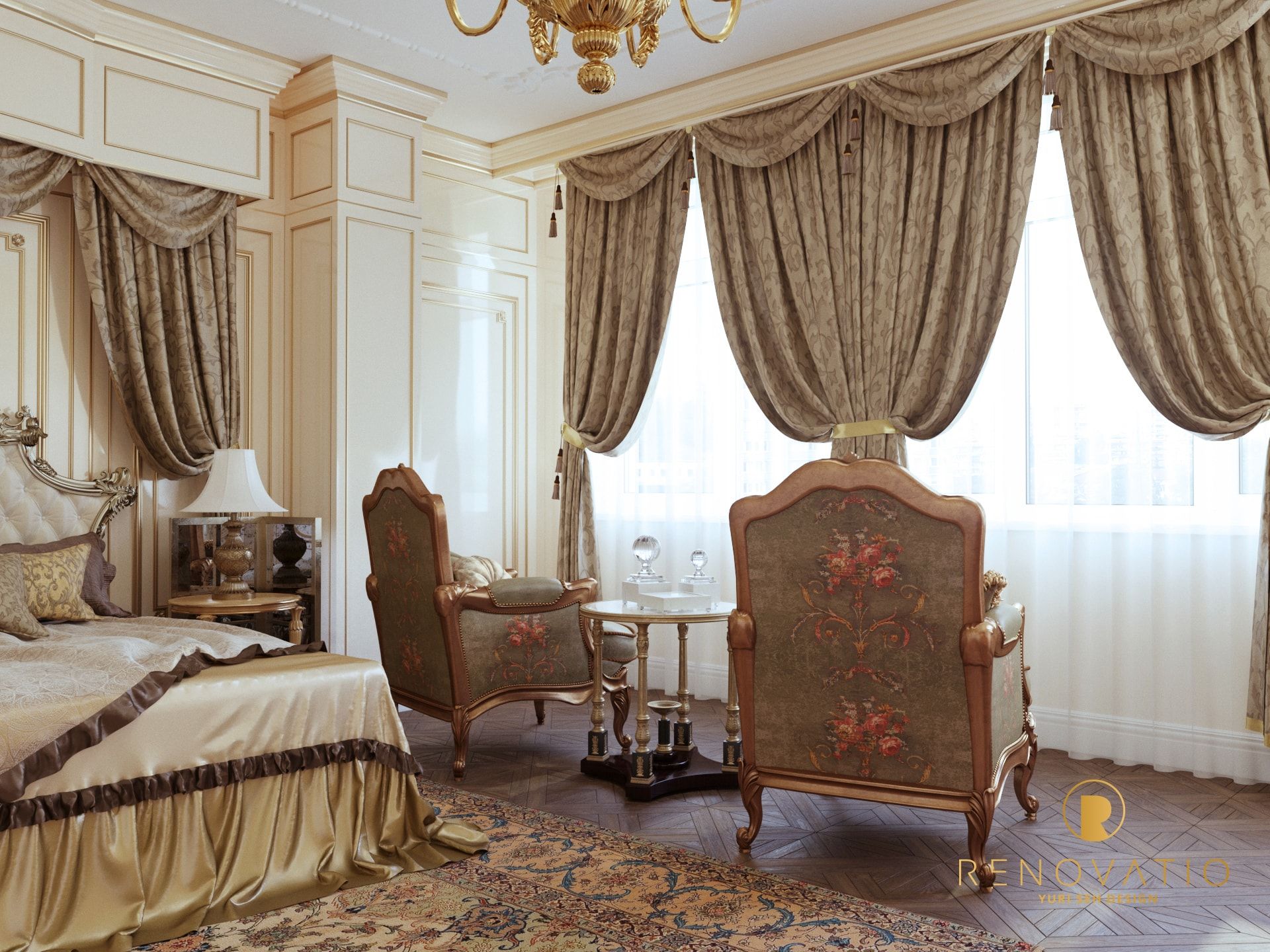 A large bed with a decorative headboard is the center of a classic bedroom. It is complemented by bedside tables, a dressing table, a laconic chest of drawers. The canopies and plenty of pillows add maximum charm to the bedroom.