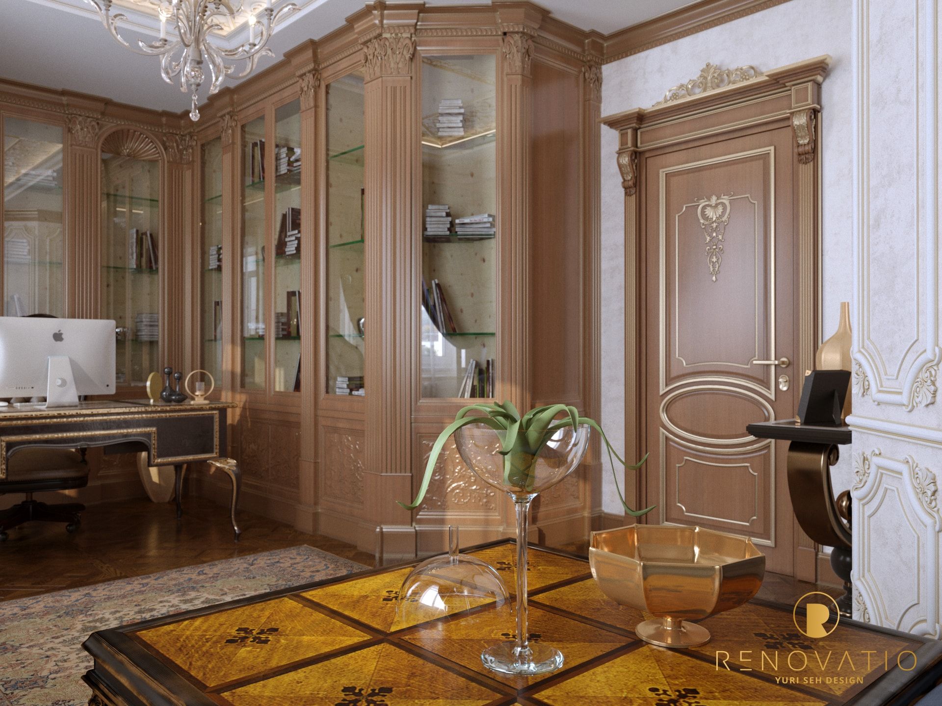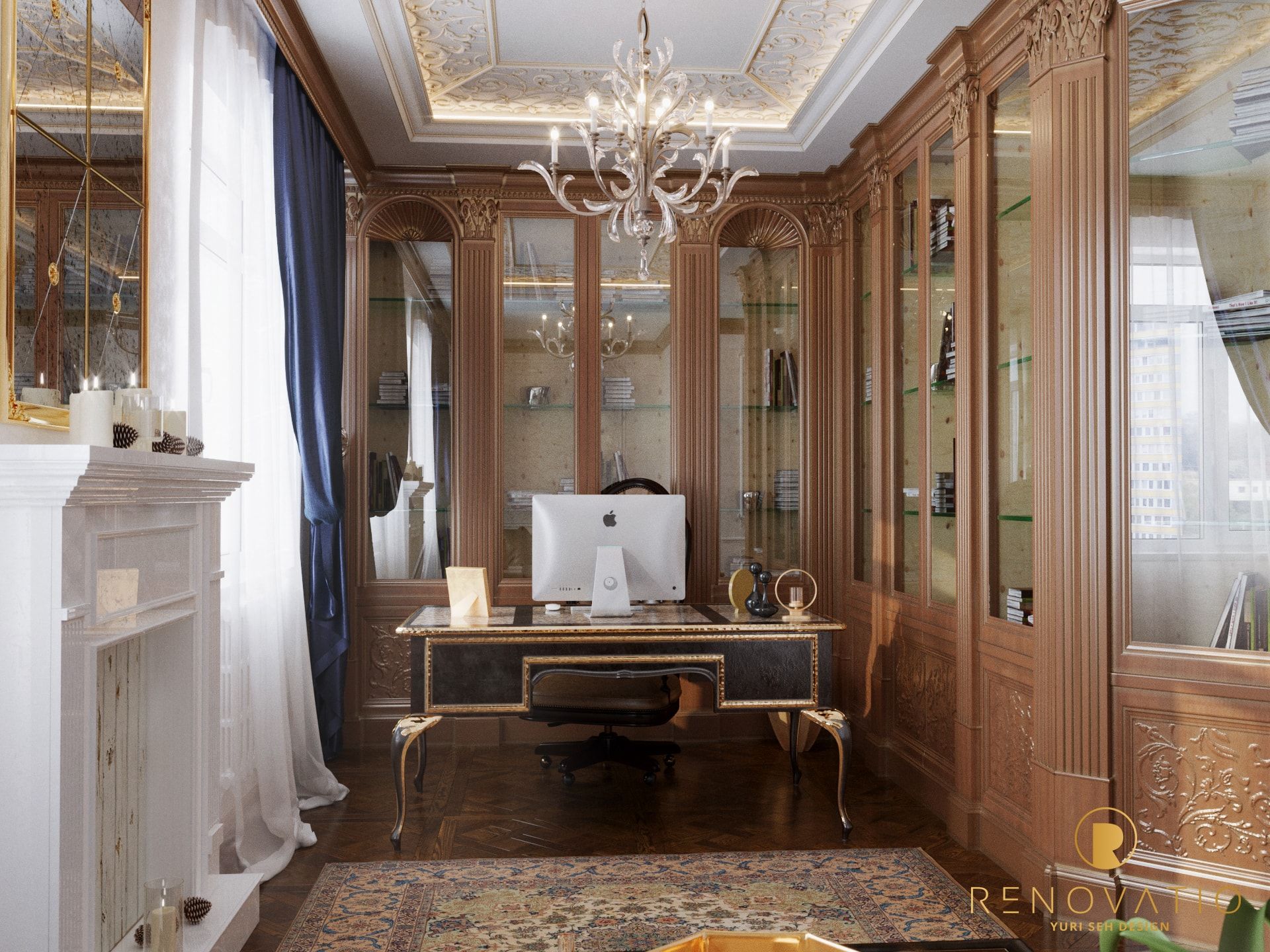 A small office with a fireplace area is a favorite place for the head of the family. There he can rest, immerse himself in tasks and be as efficient as possible. A classic table with curved legs and a natural wood wall emphasize the nobility of this room.