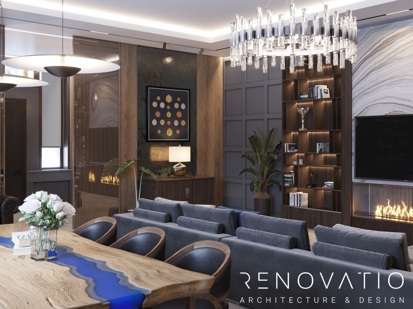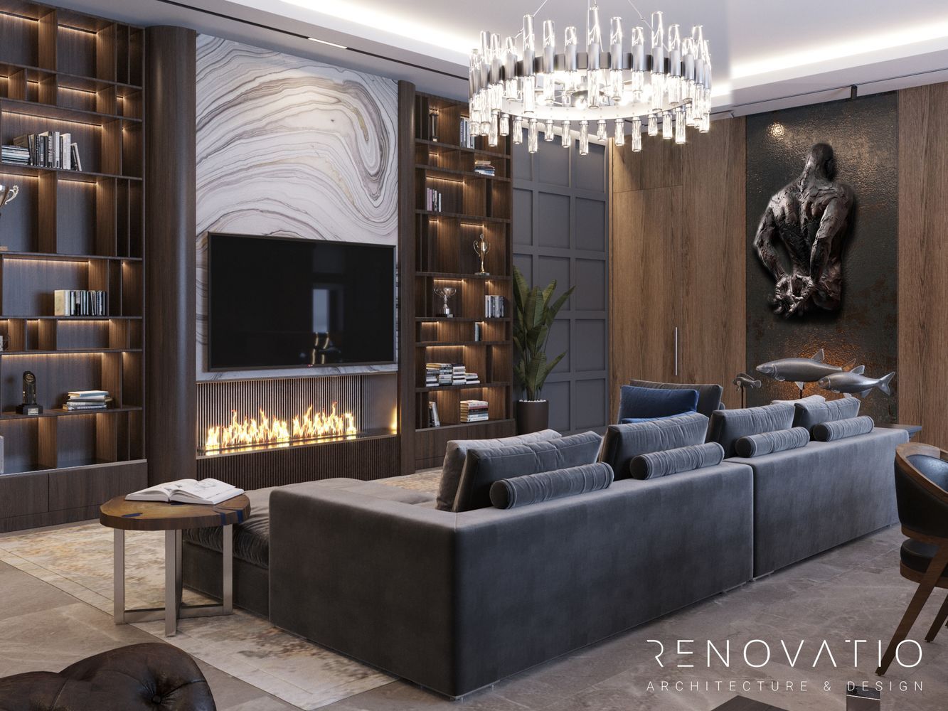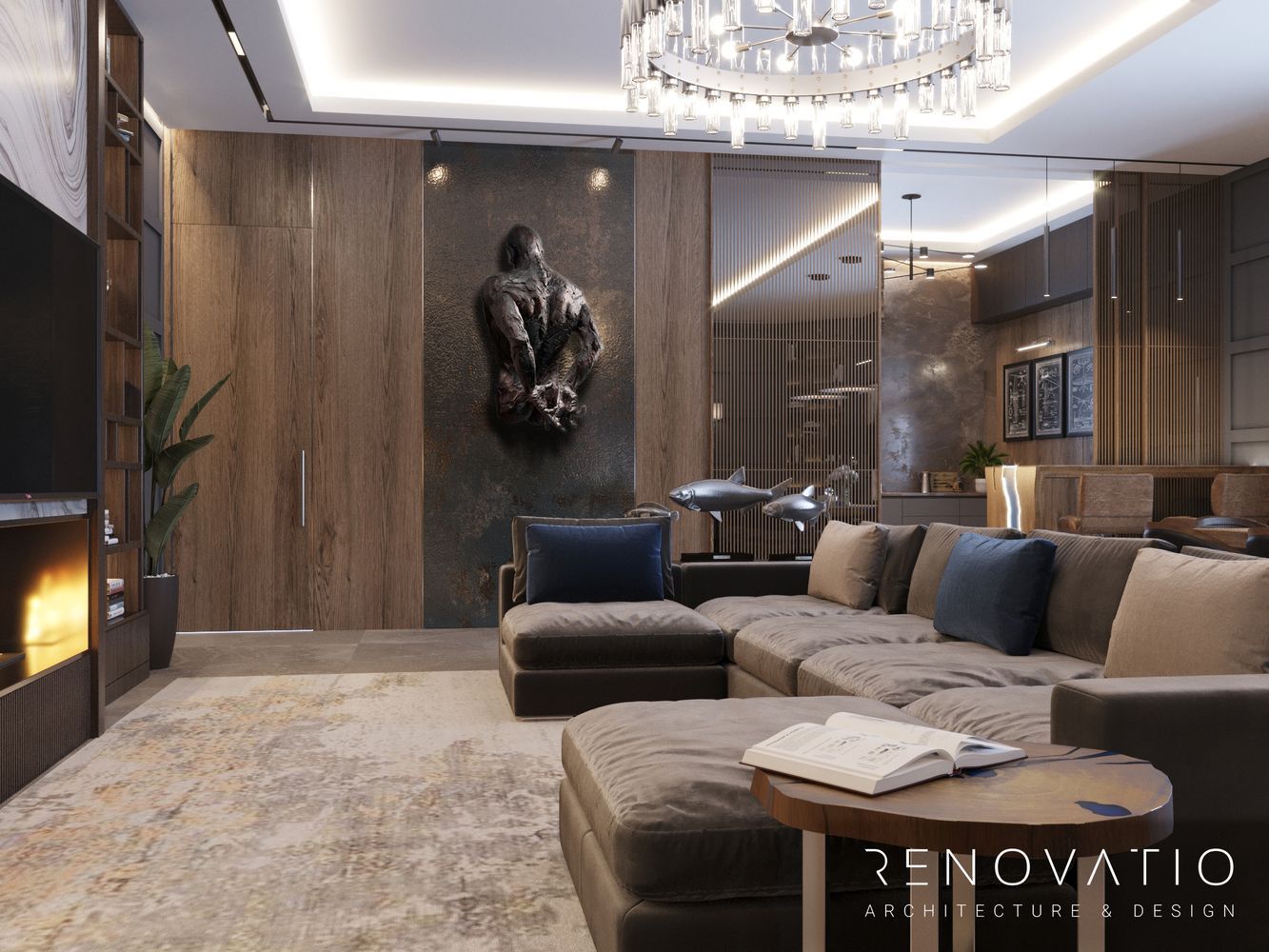Various textures such as gloss and glass, wood and marble. The selection of all details was as careful as possible. In the living area, in addition to a cozy fireplace, it was possible to place several art objects, which only emphasized the harmony of styles, its brutality. The abundance of unique decor in general is a feature of this project.