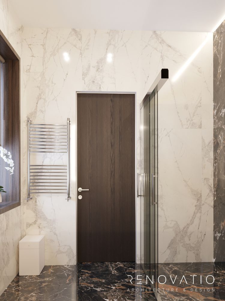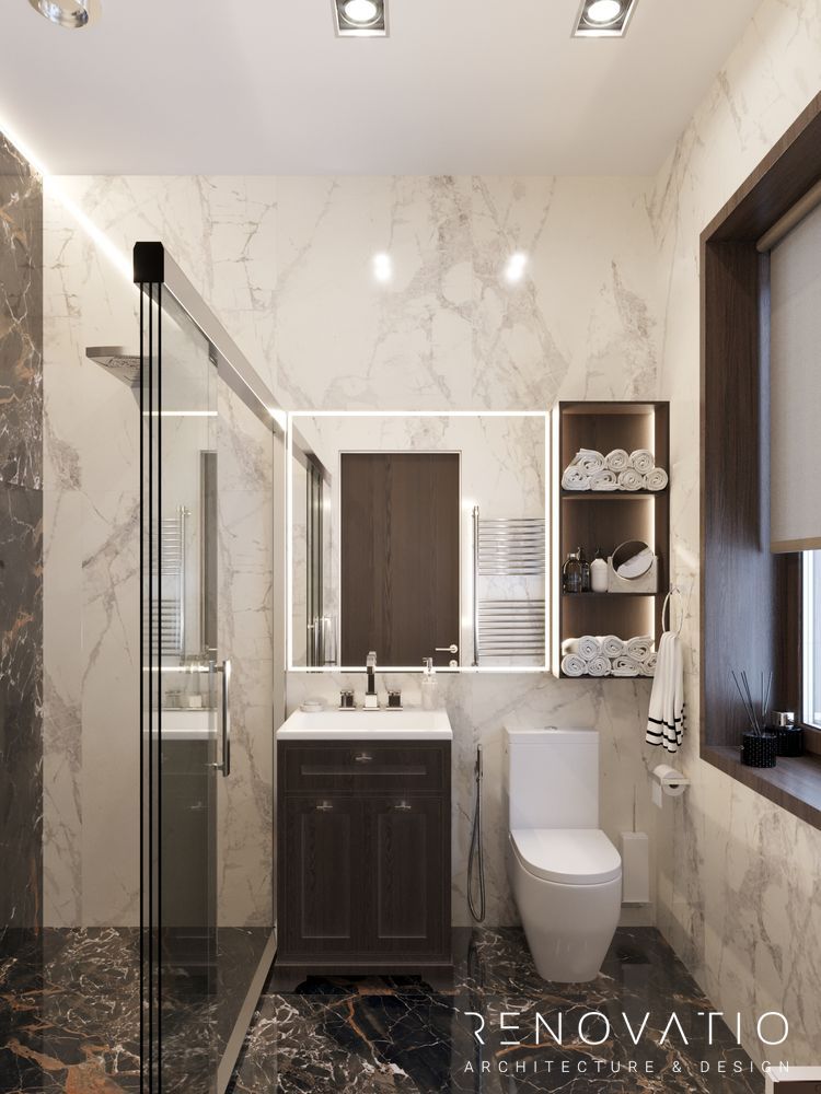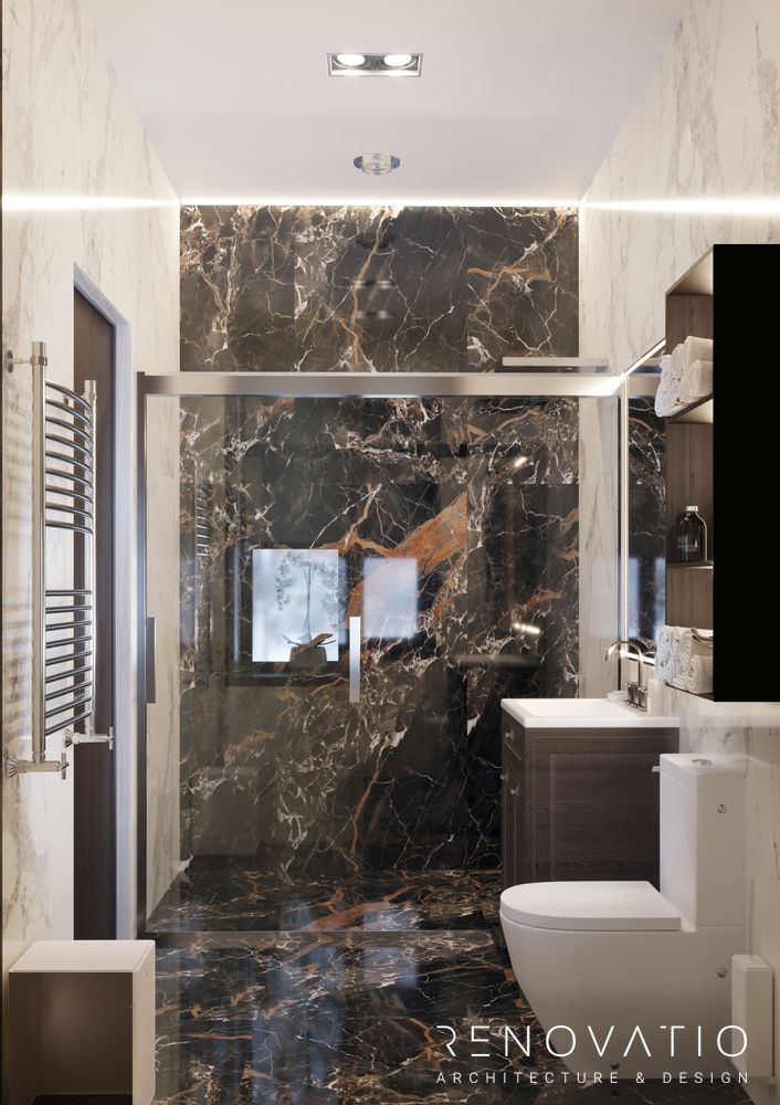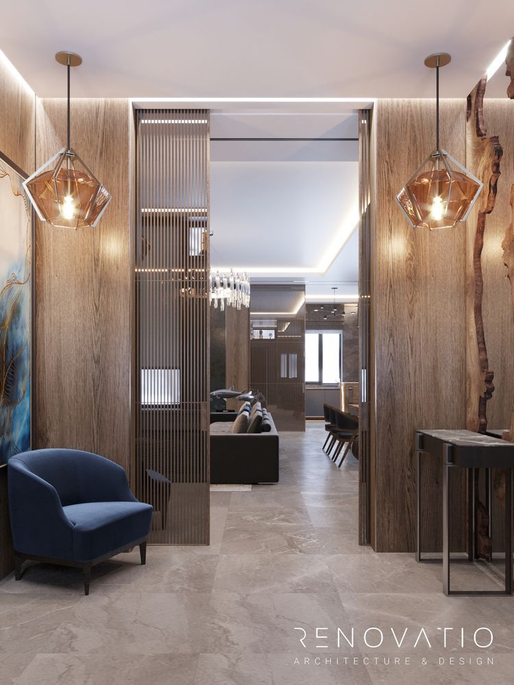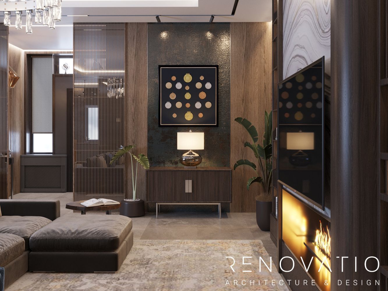 Various textures such as gloss and glass, wood and marble. The selection of all details was as careful as possible. In the living area, in addition to a cozy fireplace, it was possible to place several art objects, which only emphasized the harmony of styles, its brutality. The abundance of unique decor in general is a feature of this project.