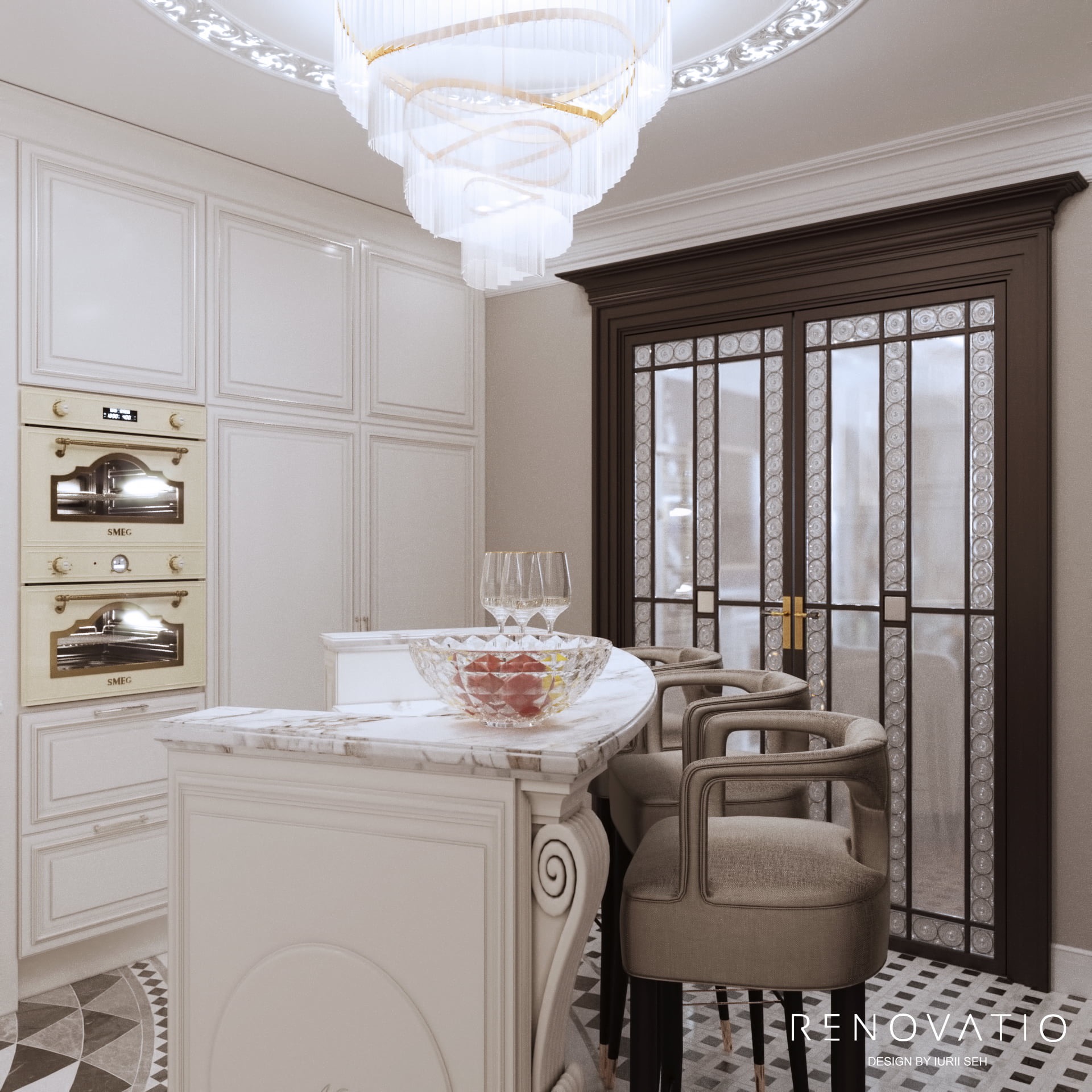 The owners of the house practically do not cook at home, so we made the kitchen area as compact as possible. Literally a corner where they could place everything they needed: a bar counter with a marble top, an oven, a stove and a minimum cooking area.
