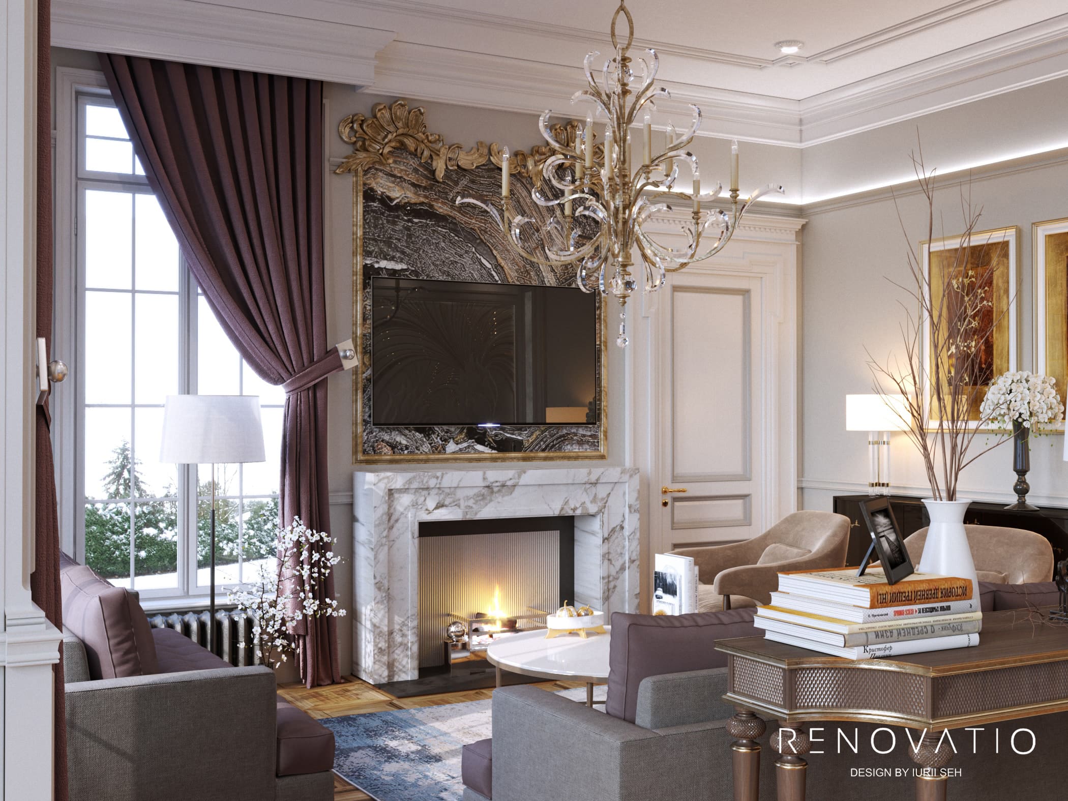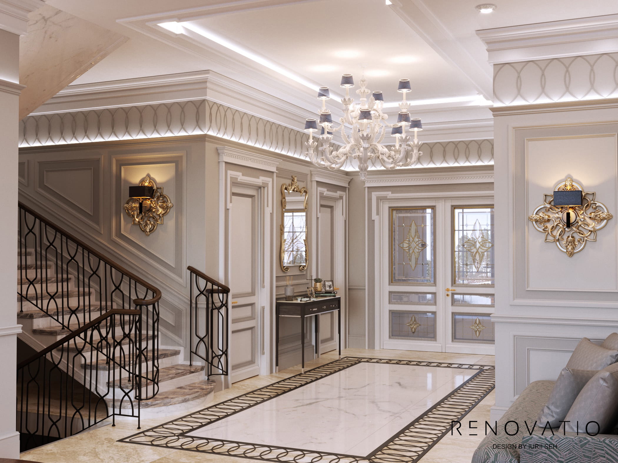 A luxurious hall with a mix of marble and wooden floors and a neoclassical chandelier immediately sets the character of the design. The "heart" of the living room with classic furniture is a fireplace with a stone portal, which has several chairs - sitting in them, it is convenient to watch the bright flames.