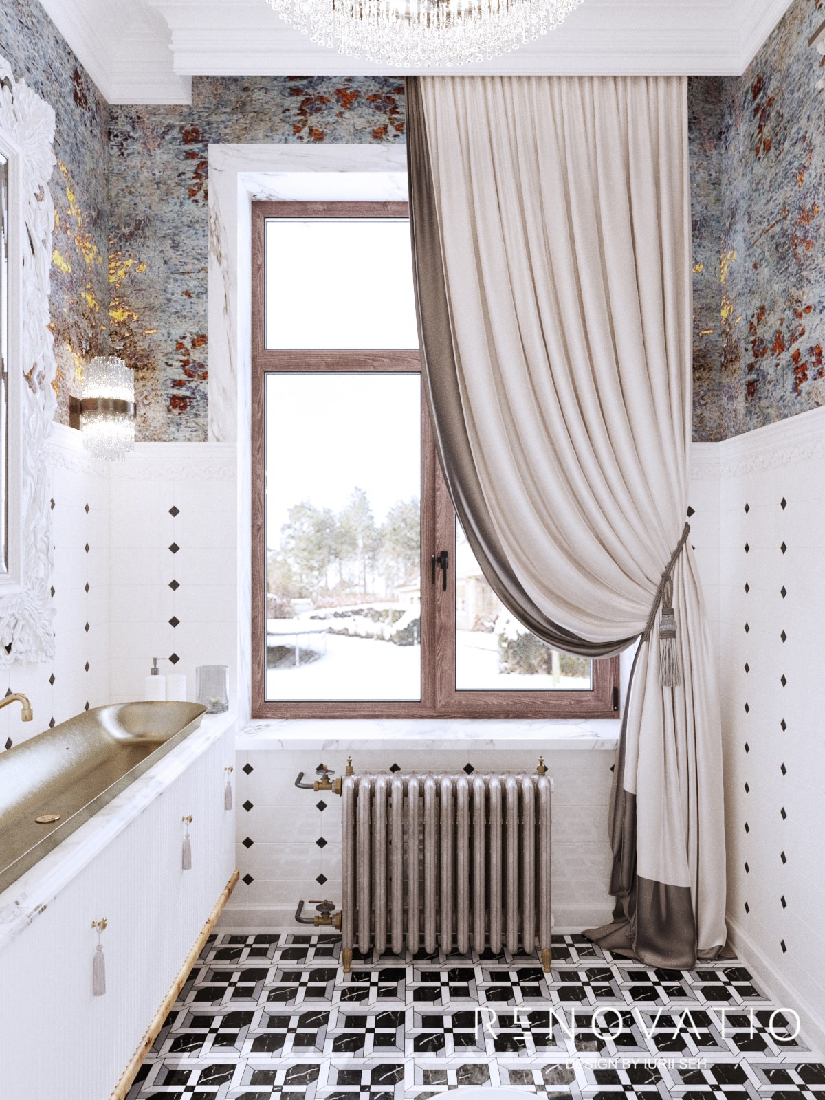Wood and ceramic tiles were chosen as flooring. With them, the design looks even more luxurious and sophisticated. The interior doors are double-leafed, which emphasizes the classic motives. The windows are decorated with heavy curtains that are laid in a wave.