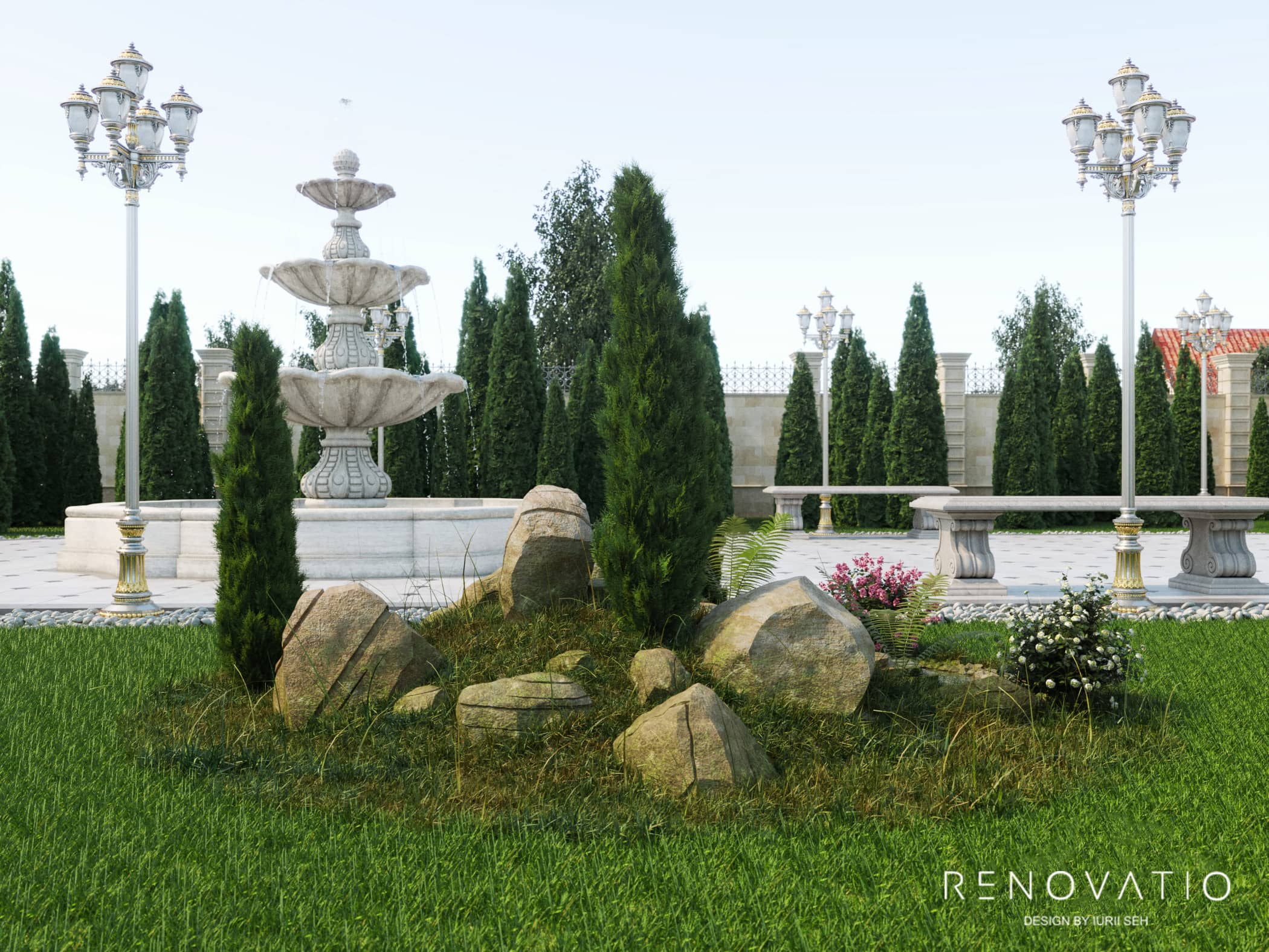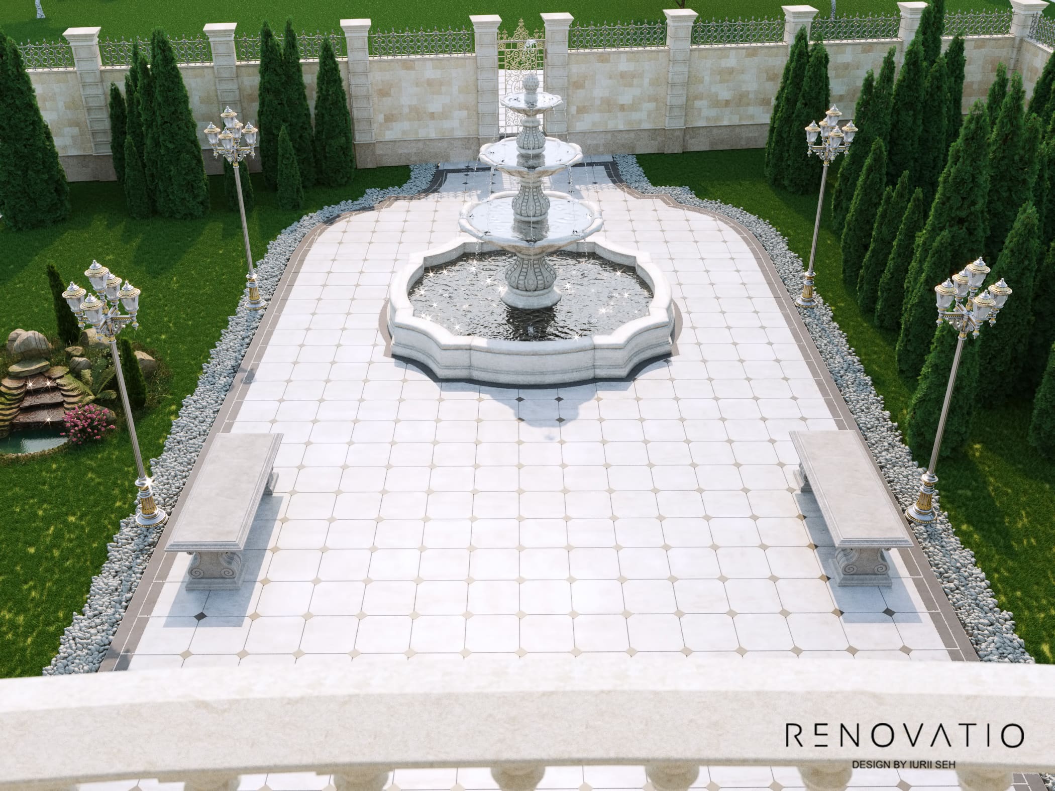 The exterior is made in light colors. They used columns, rustic corners, decorative balconies, architectural frames. A fountain in a classic style only complements the overall refined atmosphere of the exterior.