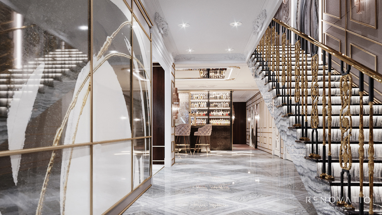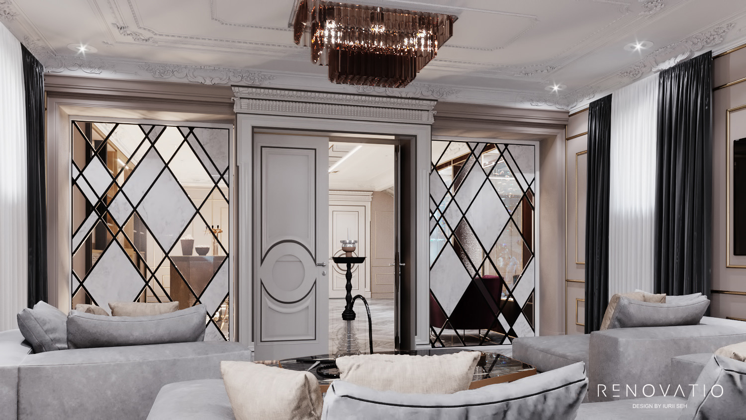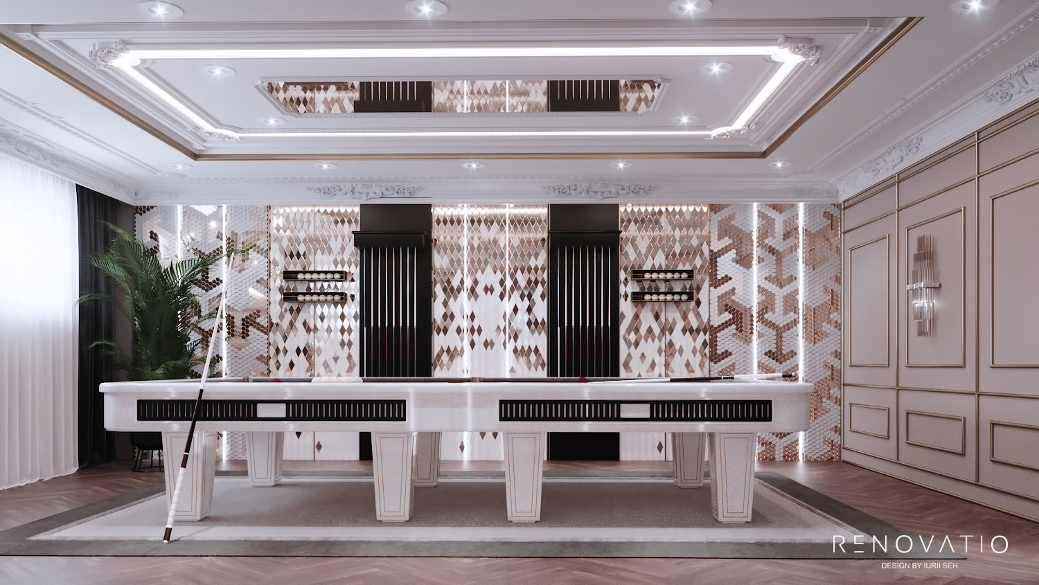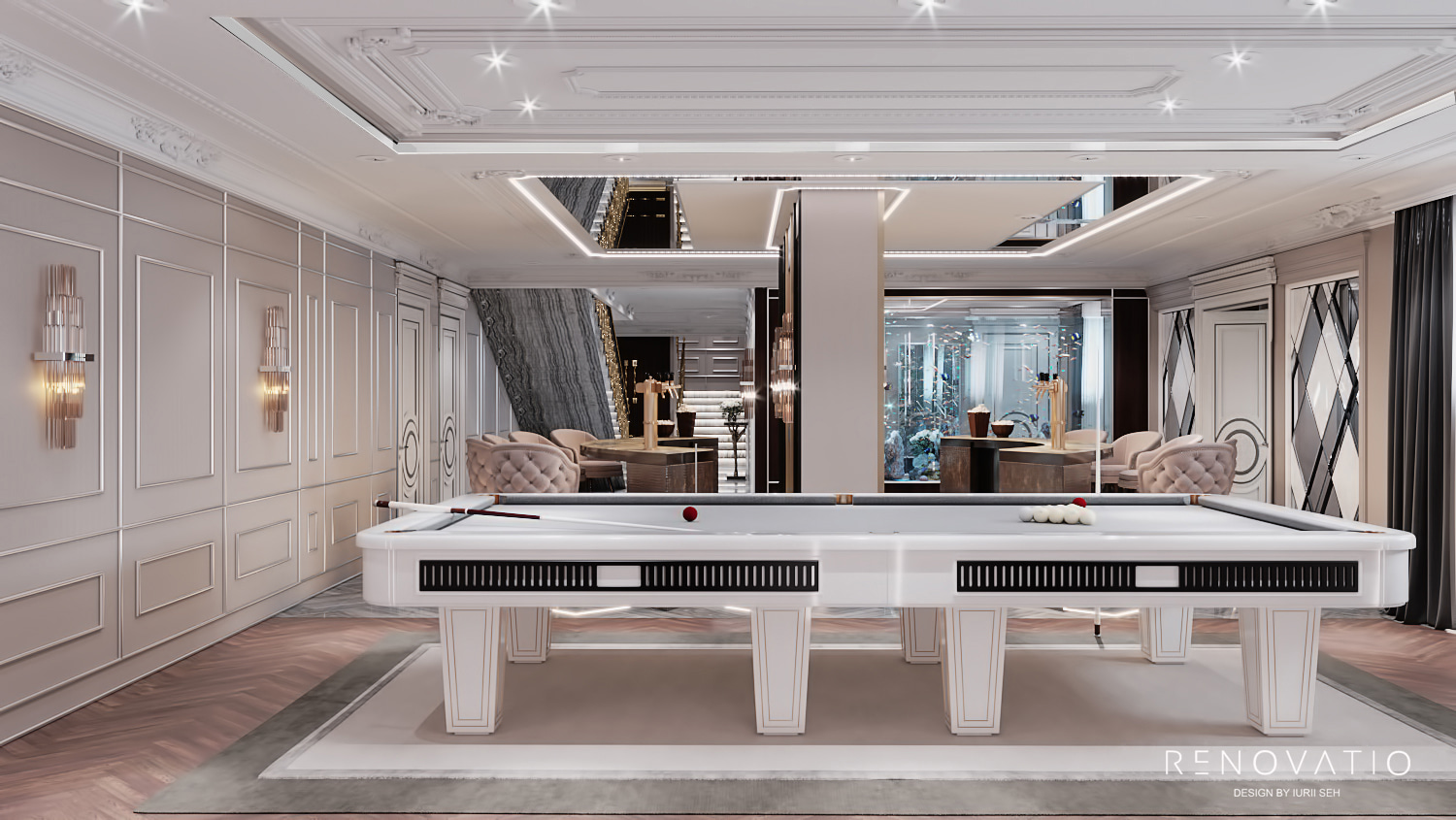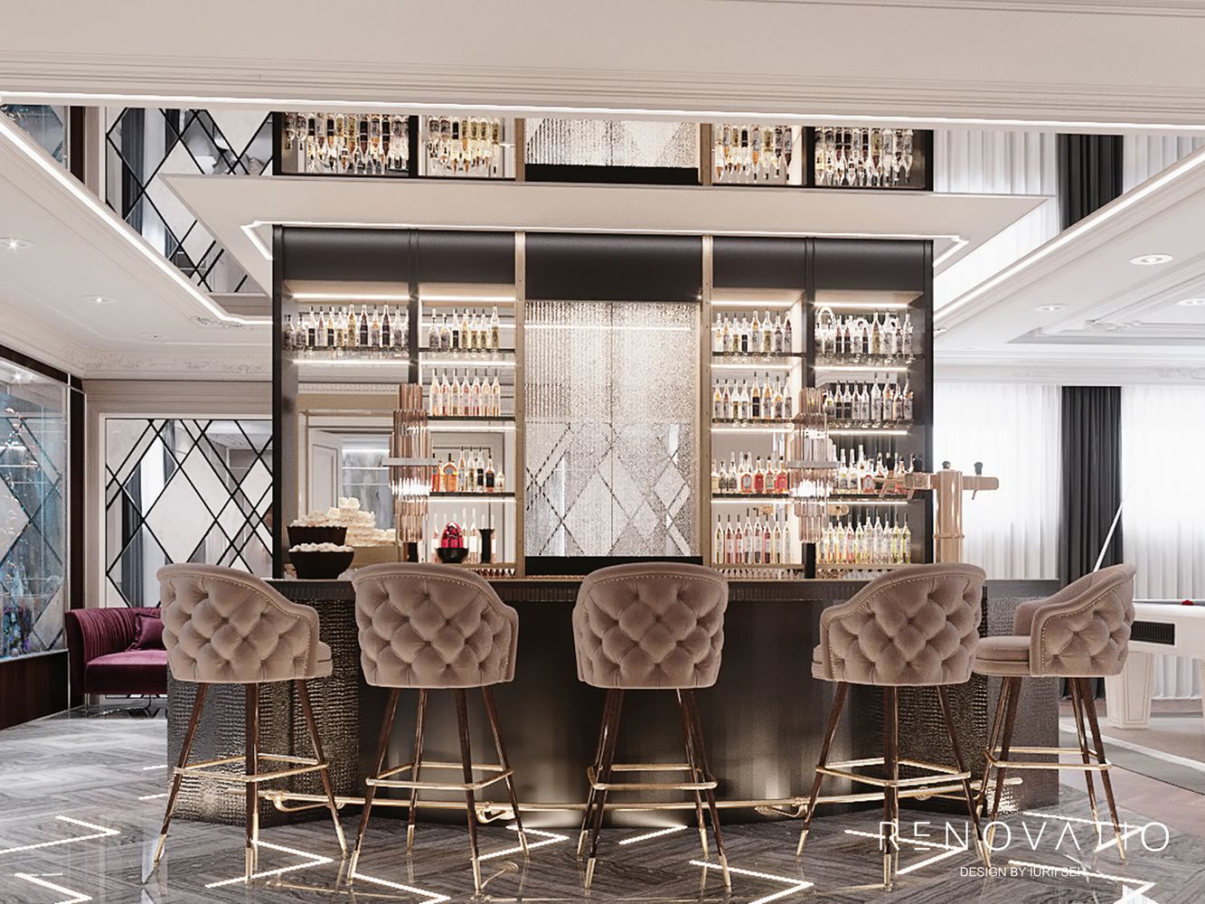 Entertainment at home can be even better than in any luxury establishment. Therefore, in this project, at the request of the owners, we have developed our own cinema, billiard room, full-fledged bar and gym.