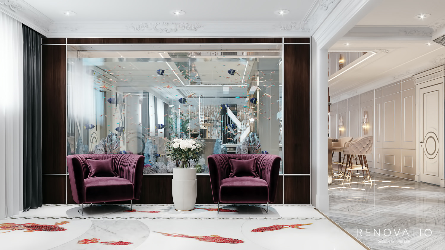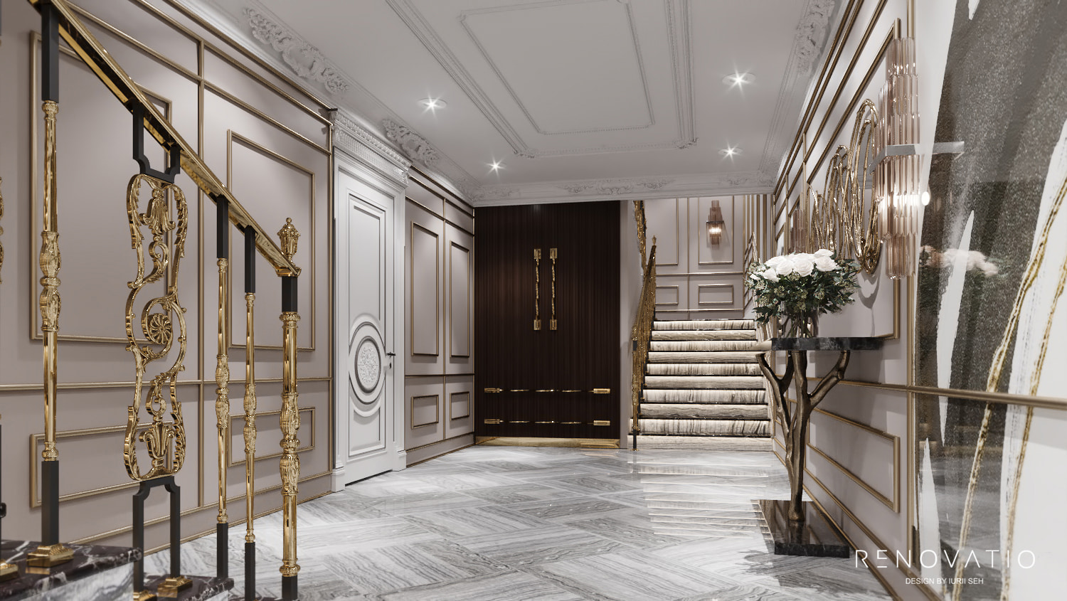 The interior is made in a neoclassical style. The base beige goes well with gold details. Burgundy color is inserted as a decorative accent.