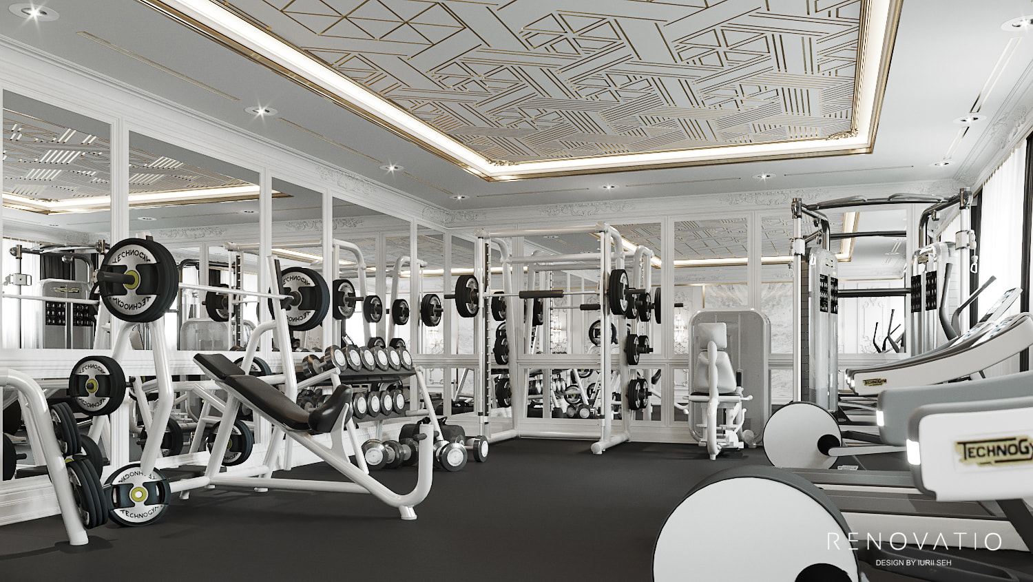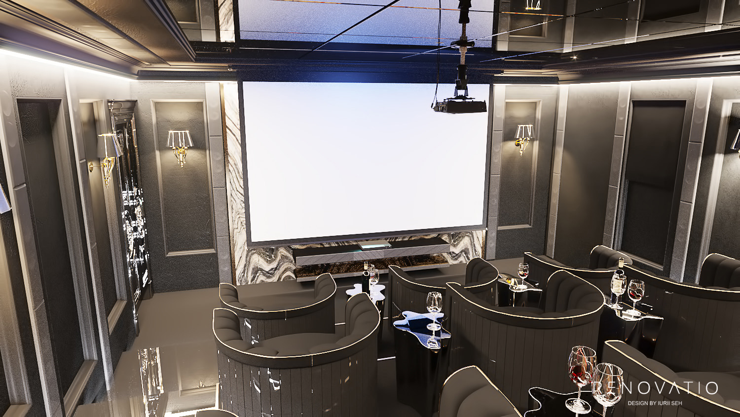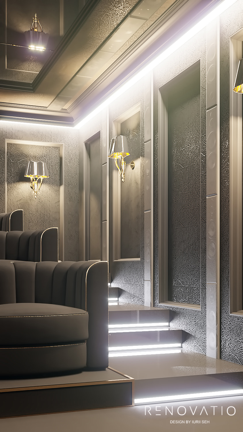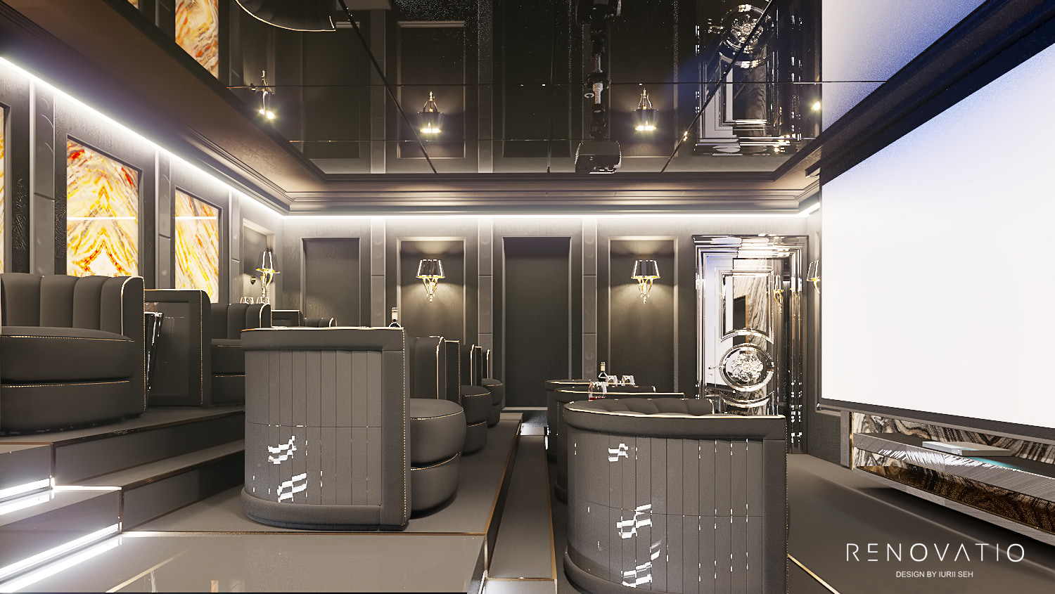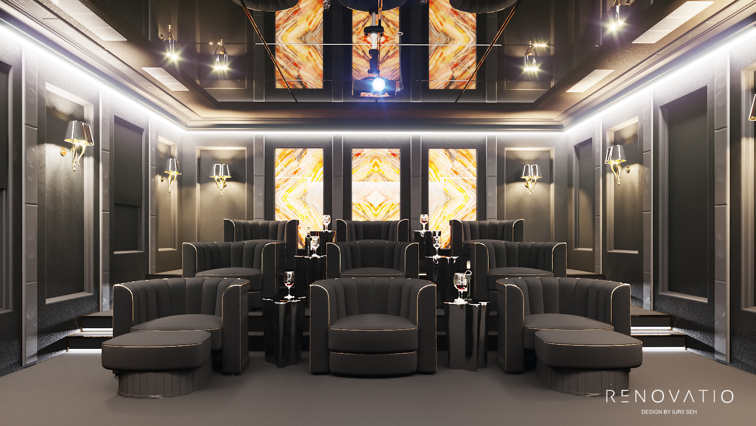 The gym and cinema are decorated with a special sound-absorbing material that makes these rooms invisible to other occupants of the house. A professional approach to the location of lighting and filling with exquisite furniture, lighting makes the cinema really perfect.