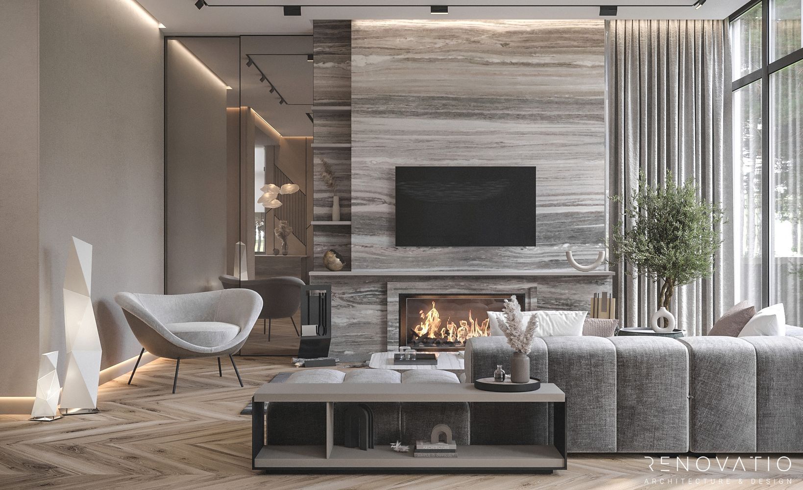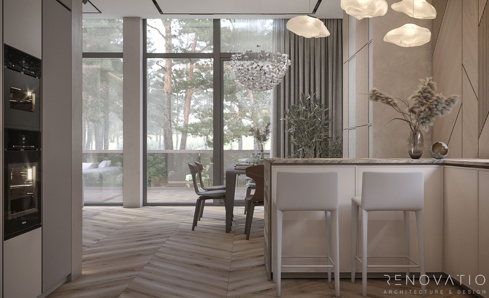 The house with an area of 3229 sq.ft. is made in a modern style. Planning is done on the principle of a large bright space. Panoramic windows, soft gray-beige color scheme. The floor is made of natural wood, which gives the house comfort and warmth.