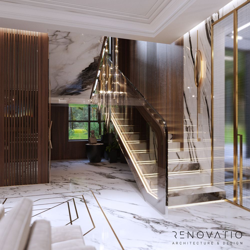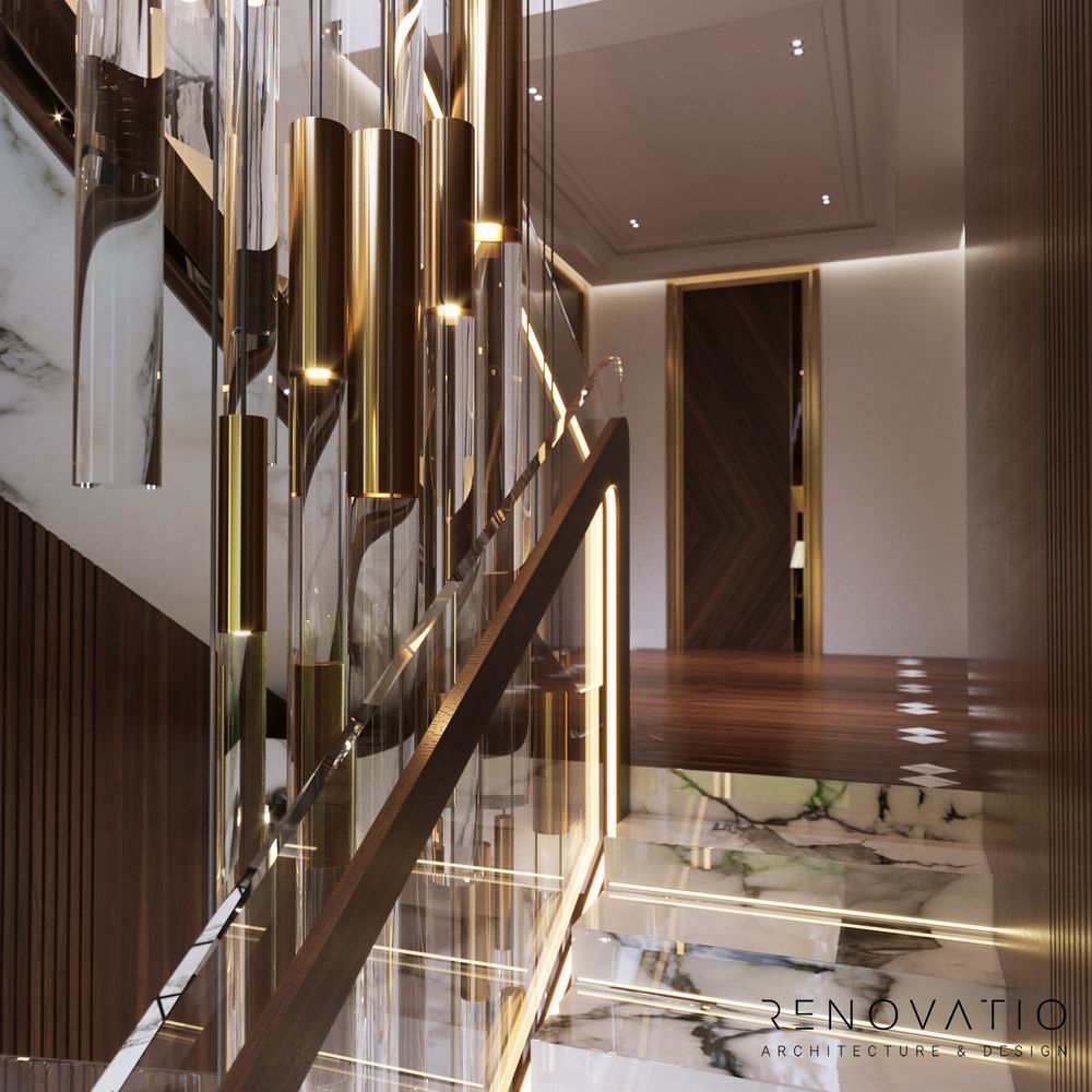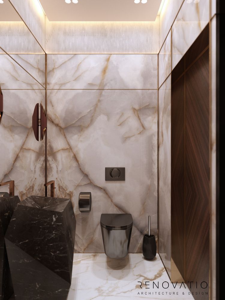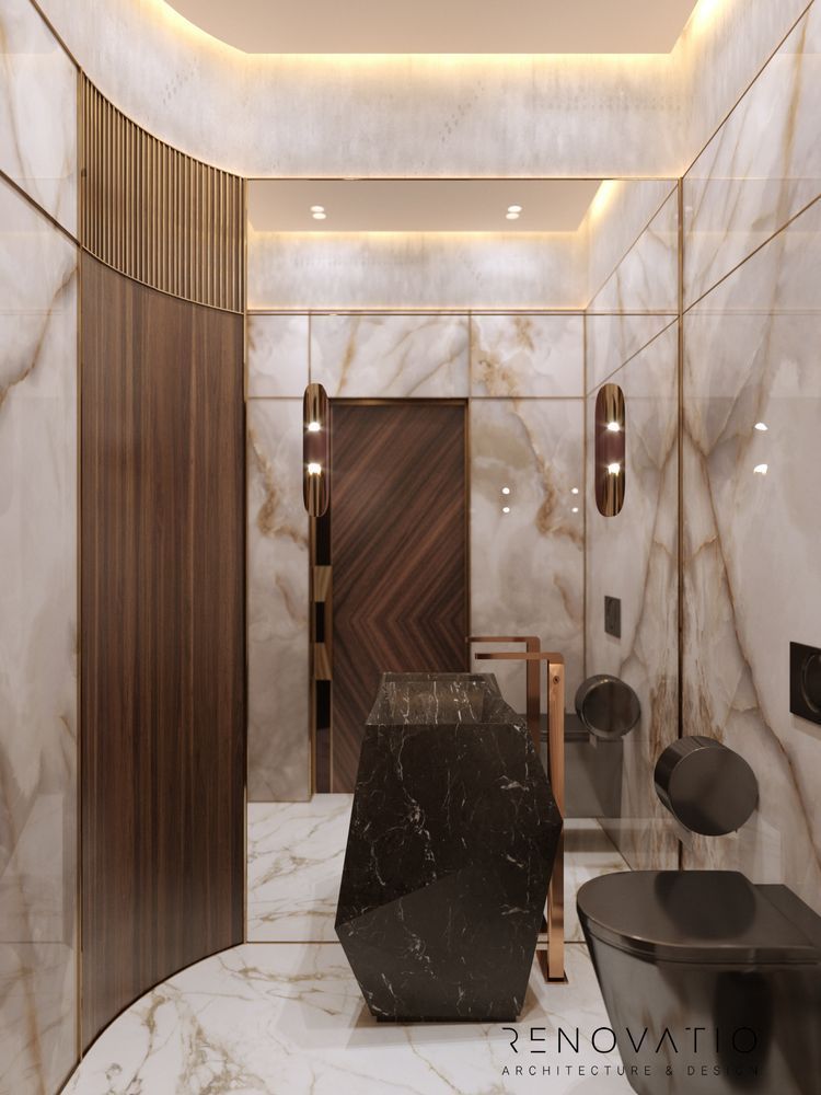 In the living area, we placed a fireplace to make this space a cozy gathering place for the whole family. The spectacular combination of marble patterns and noble gold elements gives a feeling of elegance, nobility and sophistication. On the second floor there are several bedrooms and two comfortable bathrooms. For each of the rooms, we visualized variations of colors and finishing materials to choose the customer.