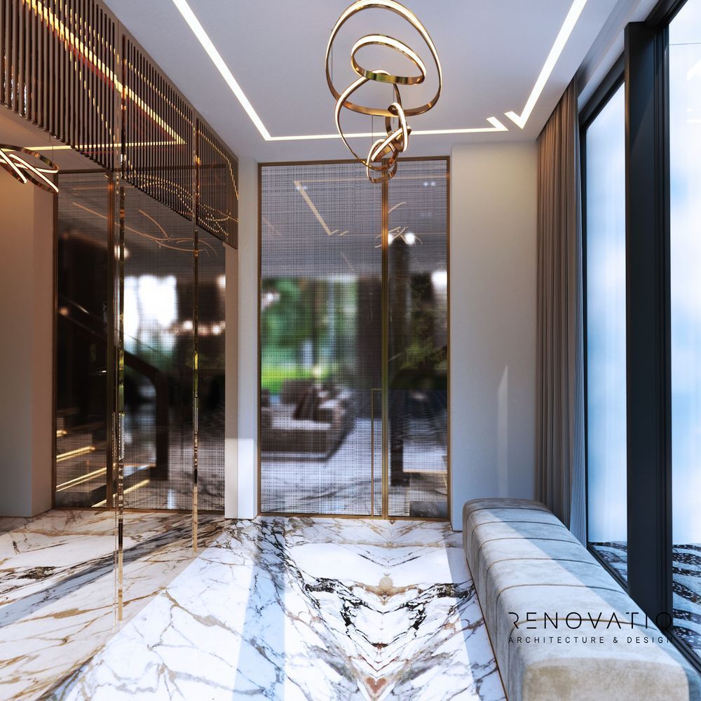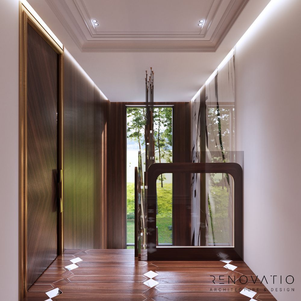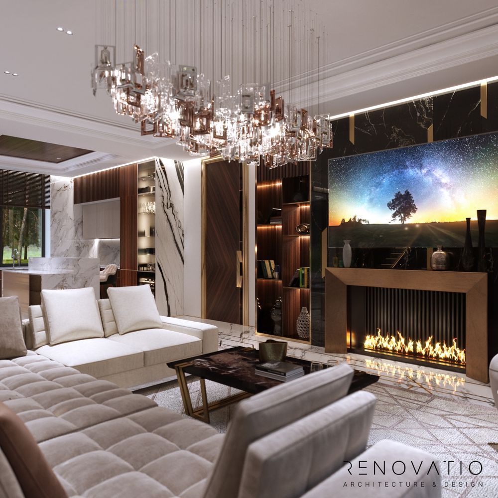 In the living area, we placed a fireplace to make this space a cozy gathering place for the whole family. The spectacular combination of marble patterns and noble gold elements gives a feeling of elegance, nobility and sophistication. On the second floor there are several bedrooms and two comfortable bathrooms. For each of the rooms, we visualized variations of colors and finishing materials to choose the customer.