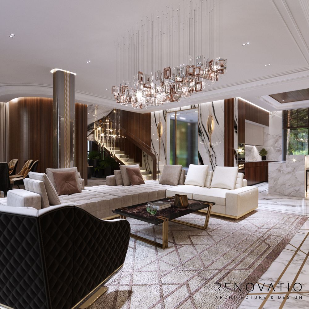 Lots of light and space is the basic concept of the project. Wide panoramic windows, lots of built-in and designer lighting give the interior richness and sophistication. The kitchen is made in a combination of white natural stone, marble floor and natural wood inserts.