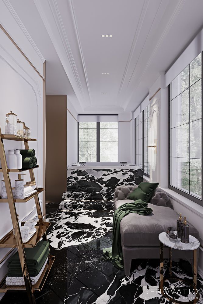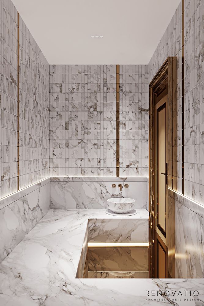 A spectacular color accent is a dark area in the bathroom, which emphasizes the presentability of the interior. Specially used stone floor, both for the hallway and for the bathroom to emphasize sophistication.