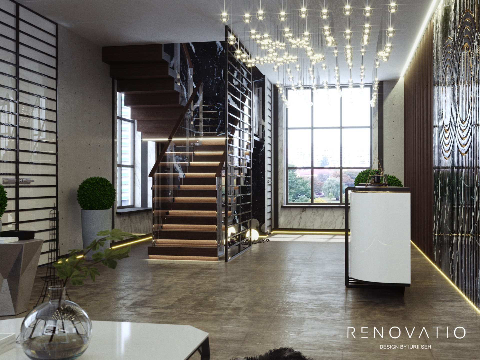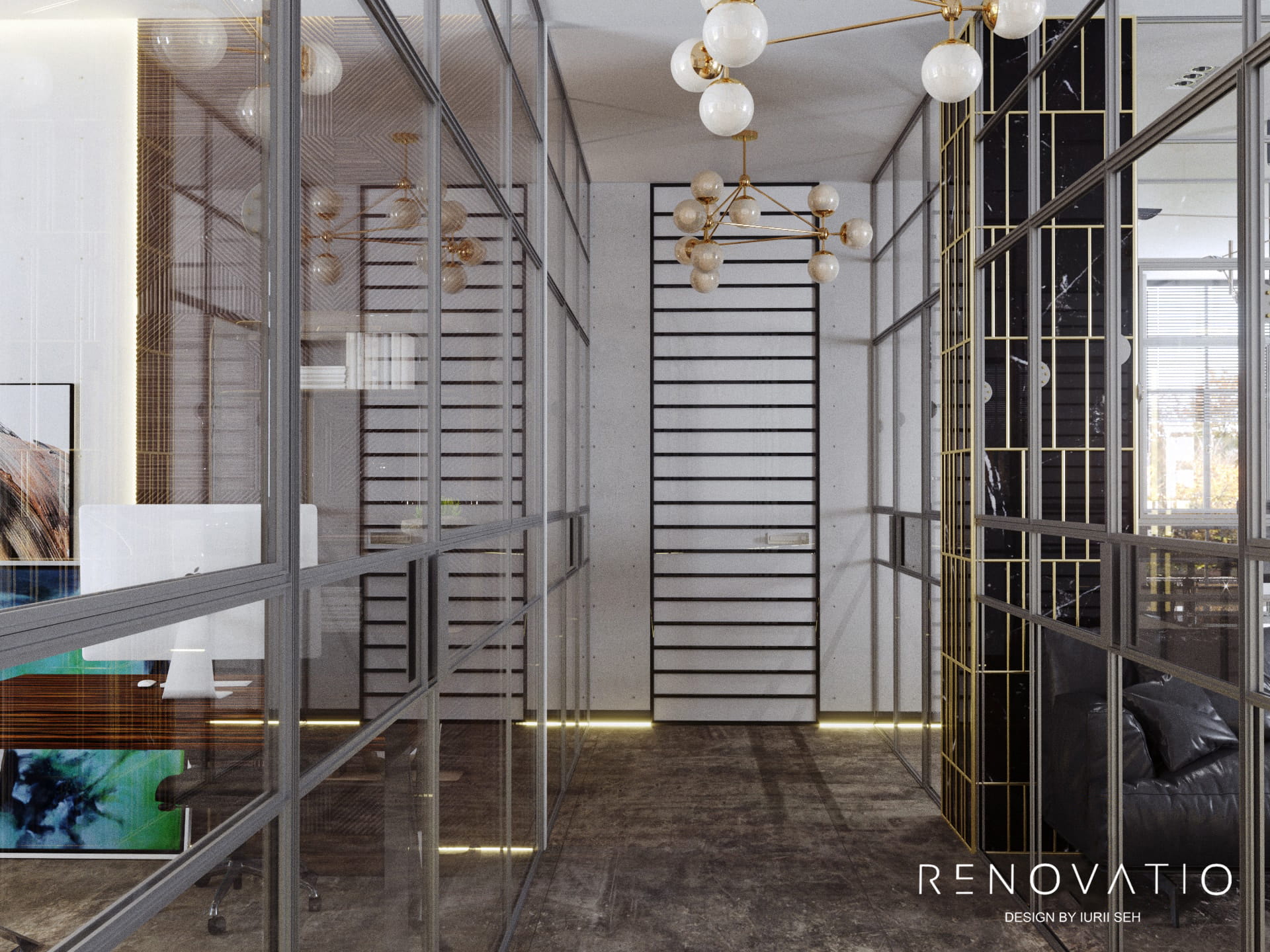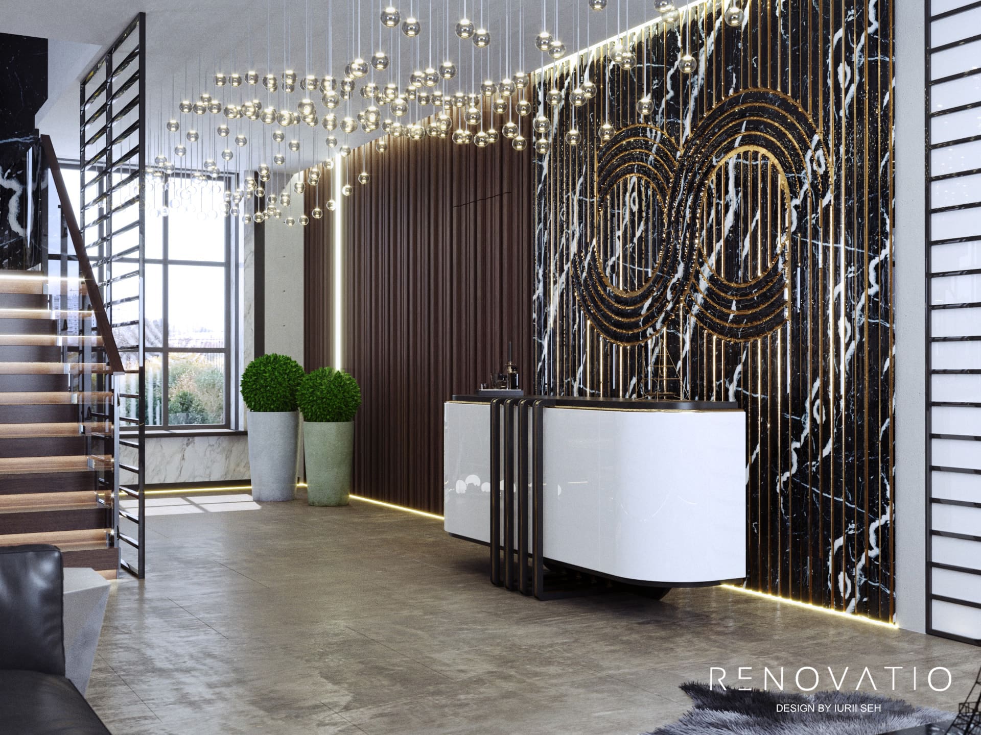 The ultra-modern reception area attracts attention with its brightness and dynamism. The entire space is divided into several zones. Furniture is grouped in such a way that it is easy to accommodate employees of several departments of the company.